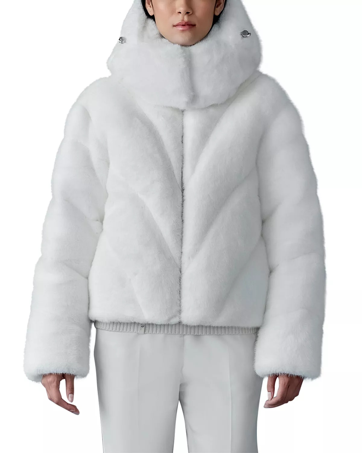 SIZE & FIT - Fits true to size, order your normal size - Model measurements: 5'10" height, 33" bust, 25" waist, 35" hips, wearing a size small PRODUCT DETAILS - Removable hood - Stand collar - Long sleeves, "M" logo patch at left sleeve - Front zip closure - Brushed faux fur, rounded graphic down channeling - Two waist zip pockets, inner zip welt pocket - Lined - Imported Web ID: 5196542 MATERIAL & CARE - Shell and lining: 100% polyester; fill: 90% duck down/10% duck feathers; fill power: 750 - Dry clean