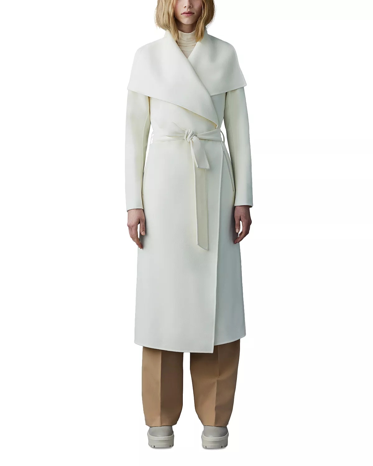 PRODUCT DETAILS - Fits true to size, order your normal size - Model measurements: 5'10" height, 33.5" bust, 23.5" waist, 34.5" hips, wearing a size small - Hand-sewn double face wool construction - Oversized shawl collar - Removable tie-front waist belt - Two leather welt pockets - Unlined - Mackage is committed to sustainability and actively challenges themselves to create products that are better for people and the planet. - Imported Web ID: 3940073 MATERIAL & CARE - 100% wool : 100% leather trim - Dry clean by leather specialist