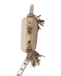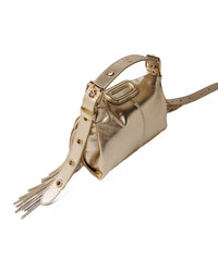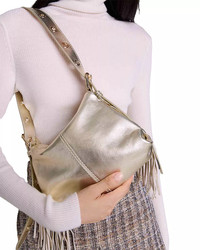 PRODUCT DETAILS - Integral top handles - Removable, adjustable crossbody strap, 22.5" drop - Dimensions: 8.6"L x 4.3"W x 5.1"H - Magnetic closure - Interior slip pocket - Metallic leather finish - Fringed sides - Lined - Main: leather; lining: 100% polyester - Imported Web ID: 5010205