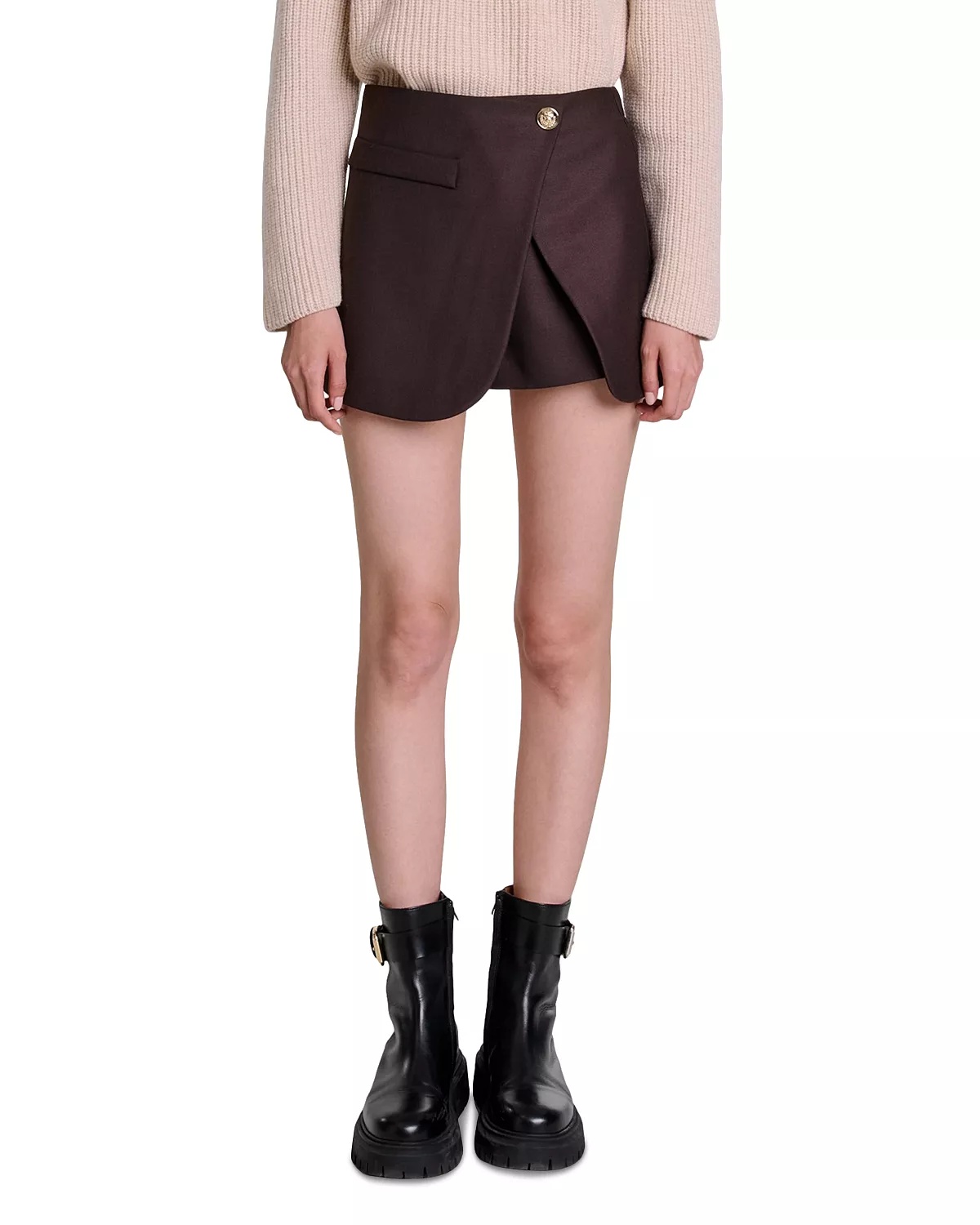 SIZE & FIT - Fits true to size, order your normal size - 11" rise, 2" inseam, 13" length, based on a size 36 PRODUCT DETAILS - Zip fastening at back - Gold-tone buttons - Elasticated back - Large side pocket - Panelled design - Open-effect panel at front - Imported Web ID: 5190964 MATERIAL & CARE - Main fabric: 52% polyester/26% wool/18% viscose/4% elastane; underside fabric: 100% polyester - Machine wash or dry clean