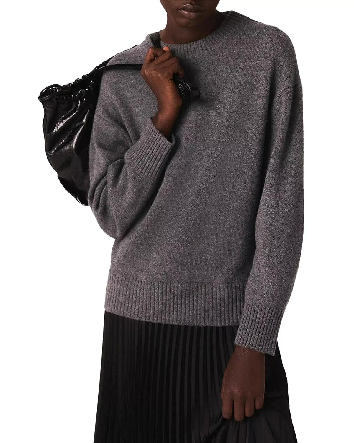 SIZE & FIT - Fits true to size, order your normal size - Designed for a boxy fit - Relaxed fit through the bust, waist, and hips - 39.5" chest circumference, 37" waist circumference - Designed for to hit at mid calf - Model measurements: 5'10" height, 33" bust, 26" waist, 35.5" hips, wearing a Maje size 36 PRODUCT DETAILS - Round neck - Pullover style, self-ties at back neck - Long sleeves - Sweater-knit bodice, rib knit trim - Pleated woven skirt attached - Imported Web ID: 5633373 MATERIAL & CARE - Knit: 89% wool/5% cashmere/5% polyamide/1% elastane; combo: 70% polyester/30% elastomultiester; rib: 89% wool/5% cashmere/5% polyamide/1% elastane - Hand wash