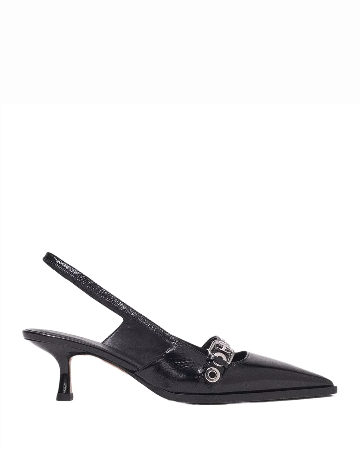 PRODUCT DETAILS - Fits true to size, order your normal size - Elastic at strap for a flexible fit - Pointed toe - Slip on with slingback strap - Strap with metal eyelet details on the front - 2.24" heel - Leather upper and lining, resin sole - Imported Web ID: 5855263