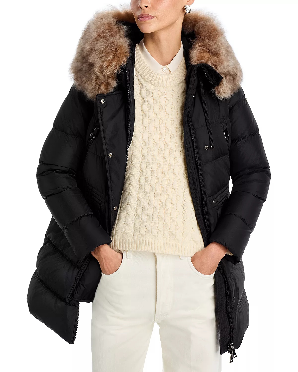 SIZE & FIT - Fits true to size, order your normal size - Model measurements: 5'10" height, 33.5" bust, 23.5" waist, 34.5" hips, wearing a size 1 or small PRODUCT DETAILS - Attached hood with shearling trim - Front zip and snap closures, concealed placket - Long sleeves - Elasticized waist - Two side front zippered pockets; two pockets with snap flaps at hips - Logo patch at upper sleeve - Quilted throughout - Lined - Note: shearling collar color appears more brown/tan in person than in image - Imported Web ID: 5133987 MATERIAL & CARE - Shell and lining: 100% polyamide; fill: 90% down/10% feathers; hood trim: real sheep shearling, origin: China, dyed, pieced - Machine wash