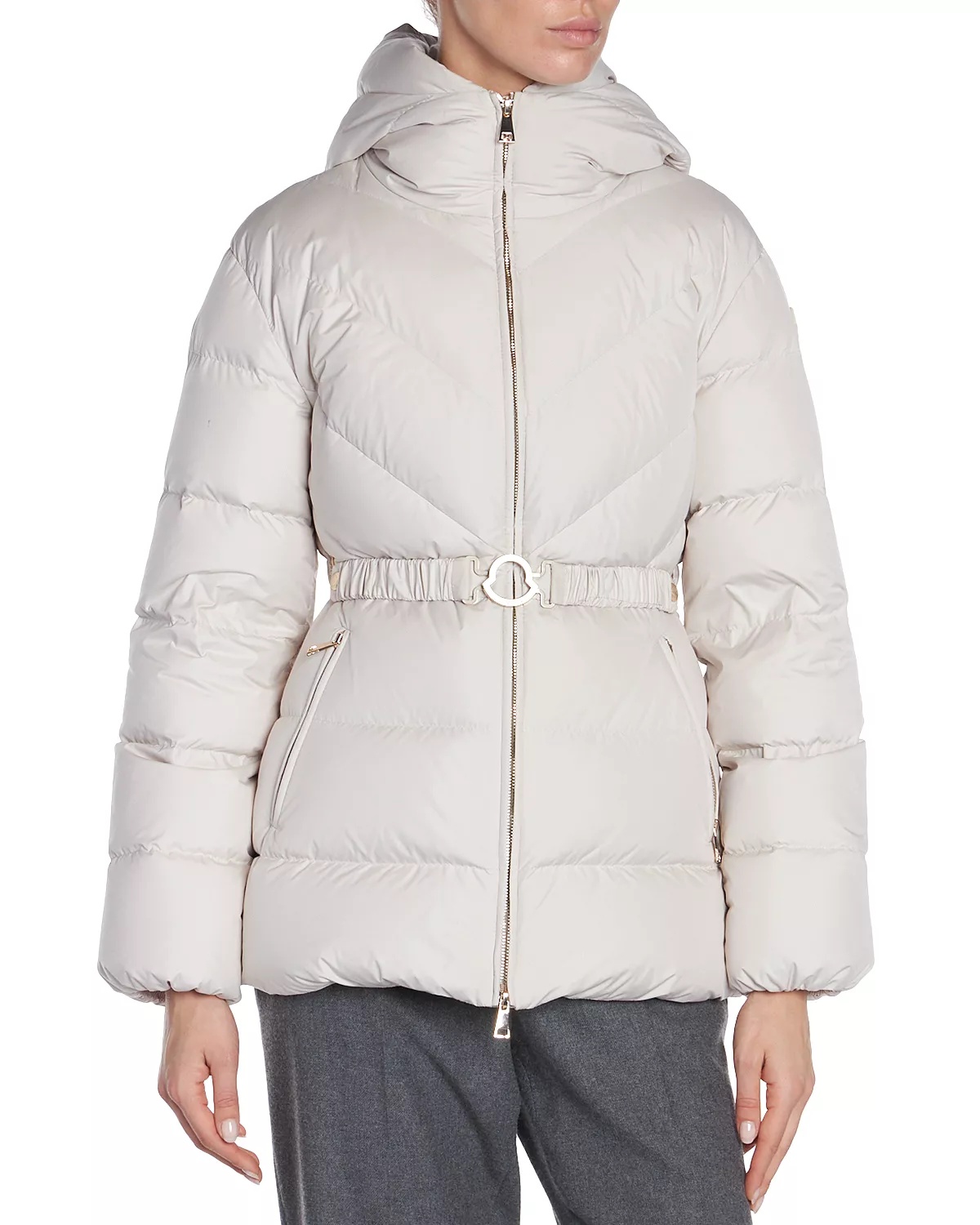 SIZE & FIT - Fits true to size, order your normal size - Model measurements: 5'10" height, 33.5" bust, 23.5" waist, 34.5" hips, wearing a size 1 or small - Moncler size conversion: 0=XS; 1=S; 2=M; 3=M/L; 4=L; 5=XL PRODUCT DETAILS - Quilted hood; ribbed stand collar - Front zipper closure - Long sleeves - Belted waist - Two side slant pockets with zipper closures - Lined - Quilted - Logo patch at upper sleeve - Made in Italy Web ID: 5133965 MATERIAL & CARE - 100% polyester; lining: 100% polyamide; hood lining: 100% polyester; fill: 90% down/10% feathers - Hand wash