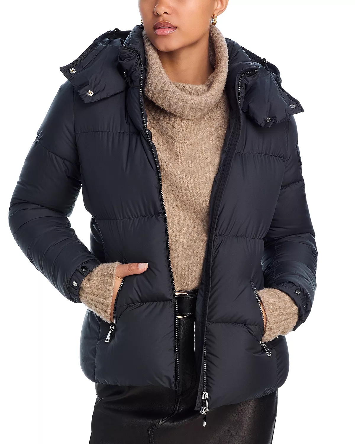 SIZE & FIT - Fits true to size, order your normal size - Designed for a slim fit - Model measurements: 5'10" height, 33" bust, 25" waist, 35" hips, wearing a size small PRODUCT DETAILS - Detachable hood, snap closures, adjustable drawcord with toggles - Stand collar - Long sleeves, snap pocket at left - Adjustable cuffs - Zip front closure - Zip pockets at side front - Water-repellent finish - Lined - Imported Web ID: 5133975 MATERIAL & CARE - 100% polyester; lining: 100% polyester; hood lining: 100% nylon leger; fill: 90% down/10% feathers - Hand wash