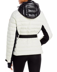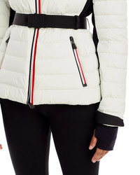 SIZE & FIT - Fits true to size, order your normal size - Designed for a slim fit - Model measurements: 5'10" height, 33.5" bust, 23.5" waist, 34.5" hips, wearing a size 1 PRODUCT DETAILS - Contrast drawcord-toggle hood - Stand collar with snap-tab closure - Long sleeves, embroidered logo patch at left sleeve - Adjustable grip-tape cuffs, recessed contrast knit thumbhole cuffs - Contrast under-sleeve and side panels - Front two-way concealed zip closure with logo pulls - Belt loops, removable contrast belt with logo buckle closure - Hip concealed zip pockets with logo pulls - Interior media pocket, ski pass pocket - Interior powder skirt with snap closure - Signature tri-tone striped trim at zips - Logo at interior neckline - Allover channel quilting - Lined - Imported Web ID: 4409165 MATERIAL & CARE - Shell: 84% nylon/16% elastane; top lining: 95% nylon/5% elastane; sleeve lining: 92% polyester/8% elastane; bottom lining & hood: 100% nylon; fill: 90% down/10% feathers; padding: 100% polyester - Machine wash