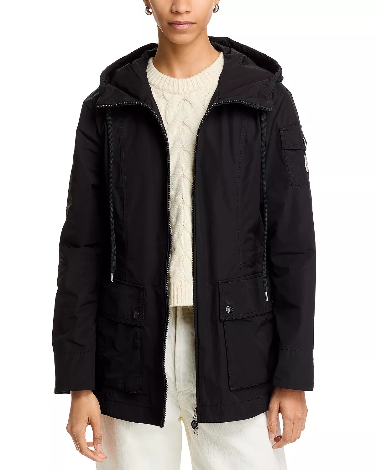 SIZE & FIT - Order your normal size or consider ordering next size up for a looser look - Designed for a slim fit - Model measurements: 5'10" height, 33" bust, 25" waist, 35" hips, wearing a size 1/small PRODUCT DETAILS - Attached hood - Front zipper closure - Long sleeves - Cinched waist - Two flap pockets at hips; flap pocket at upper sleeve - Logo patch at sleeve pocket - Made in Italy Web ID: 5379331 MATERIAL & CARE - 60% polyester/40% cotton; hood lining: 60% polyester/40% cotton - Machine wash or dry clean