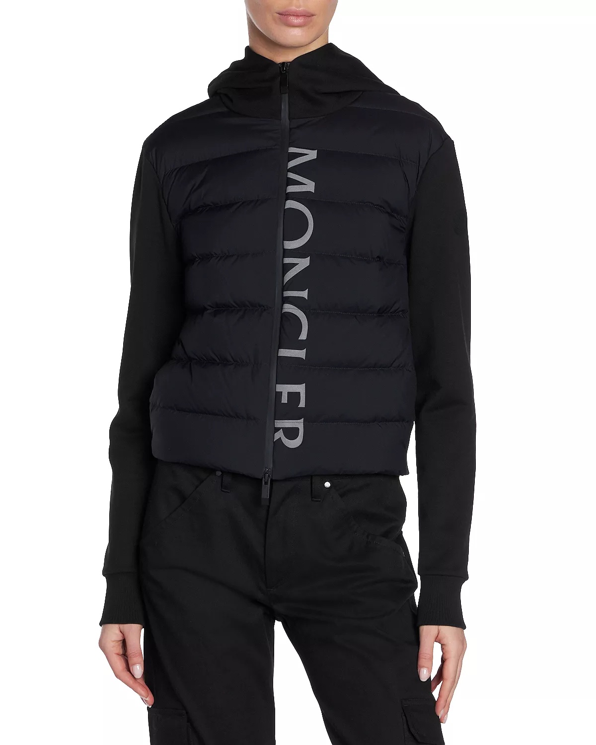 SIZE & FIT - Fits true to size, order your normal size - Model measurements: 5'10" height, 33.5" bust, 23.5" waist, 34.5" hips, wearing a size small PRODUCT DETAILS - Attached, knit hood - Front zipper closure - Long, sweatshirt-style sleeves - Lined - Quilted puffer body - Moncler graphic at front - Imported Web ID: 5132470 MATERIAL & CARE - Hood: 100% cotton; outer front: 100% polyamide; base: 100% cotton; hood lining: 100% cotton; front lining: 100% polyamide; fill: 90% down/10% feathers - Hand wash