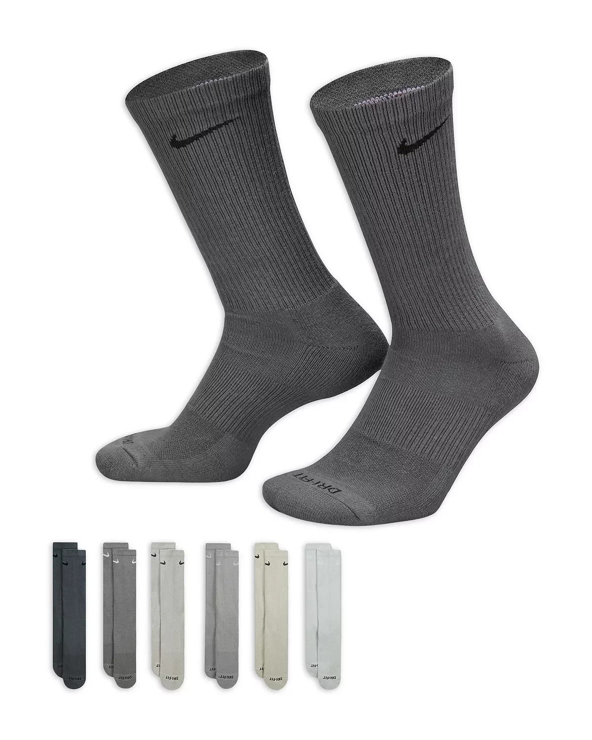 PRODUCT DETAILS - Pack of six pairs of solid crew socks - Ribbed-knit cuffs - Calf height - Logo detailing below cuffs - Cushioning under the forefoot and heel helps soften the impact of your workout - Dri-FIT technology helps your feet stay dry and comfortable - Band around the arch feels snug and supportive - Breathable knit pattern on top adds ventilation - Reinforced heel and toe are made to last - Imported Web ID: 3841033 MATERIAL & CARE - 64% cotton/33% polyester/2% spandex/1% nylon - Machine wash