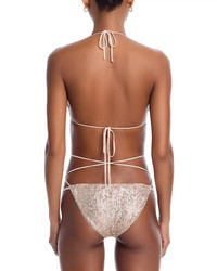 SIZE & FIT - Swimwear sizing fits smaller than apparel sizing, order one size up for more coverage - Model measurements: 5'10" height, 33" bust, 25" waist, 35" hips, wearing a size small PRODUCT DETAILS - Triangle top: halter V-neck, sleeveless, extra long string straps to cross & tie, sequined - Bottoms: pull-on style, high cut leg, side string ties on bottom, minimal seat coverage, sequined - Protective adhesive strip must remain in garment to be eligible for refund - Lined - Imported Web ID: 5411113 MATERIAL & CARE - Polyester/spandex; lining: nylon/spandex - Hand wash