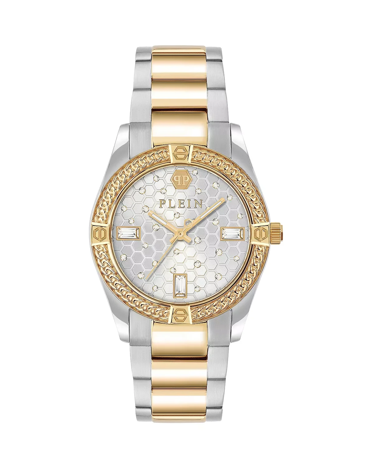 PRODUCT DETAILS - Gold IP; stainless steel; mineral crystal - Case size: 36mm - Deployant clasp closure - Water resistant to 5 ATM - Quartz movement - Silver-tone dial with crystal markers - Gold-tone chain-motif bezel - Two-tone stainless steel link bracelet - Manufacturer's 2-year limited warranty - Photo may have been enlarged and/or enhanced - Imported Web ID: 5842913