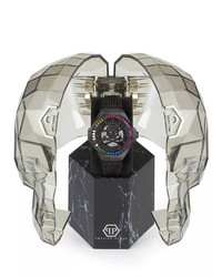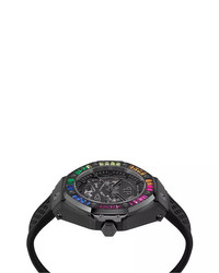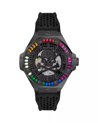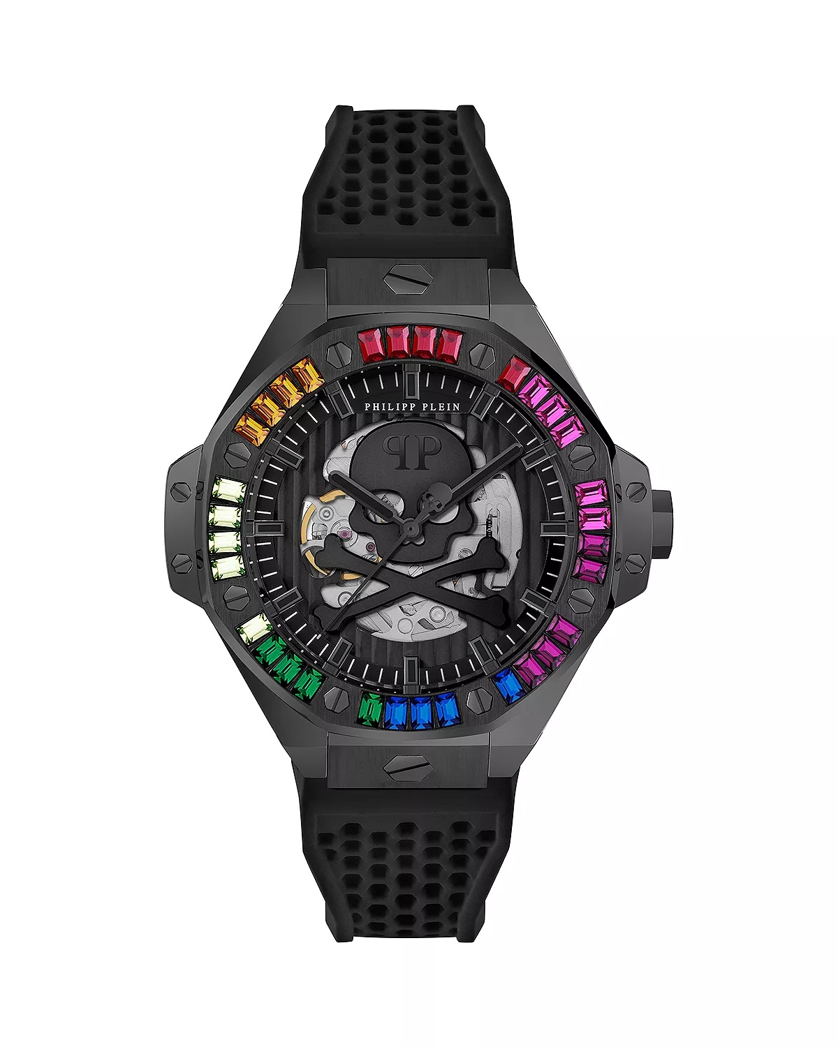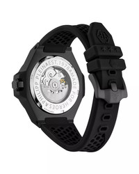 PRODUCT DETAILS - Black ionic plating; stainless steel; silicone; mineral crystal - Case size: 46mm - Ardillon buckle closure - Water resistant to 5 ATM - Three-hand automatic movement - Black skeleton dial - Preciosa crystal bezel - Black silicone strap - Manufacturer's 2-year limited warranty - Photo may have been enlarged and/or enhanced. - Imported Web ID: 5052271