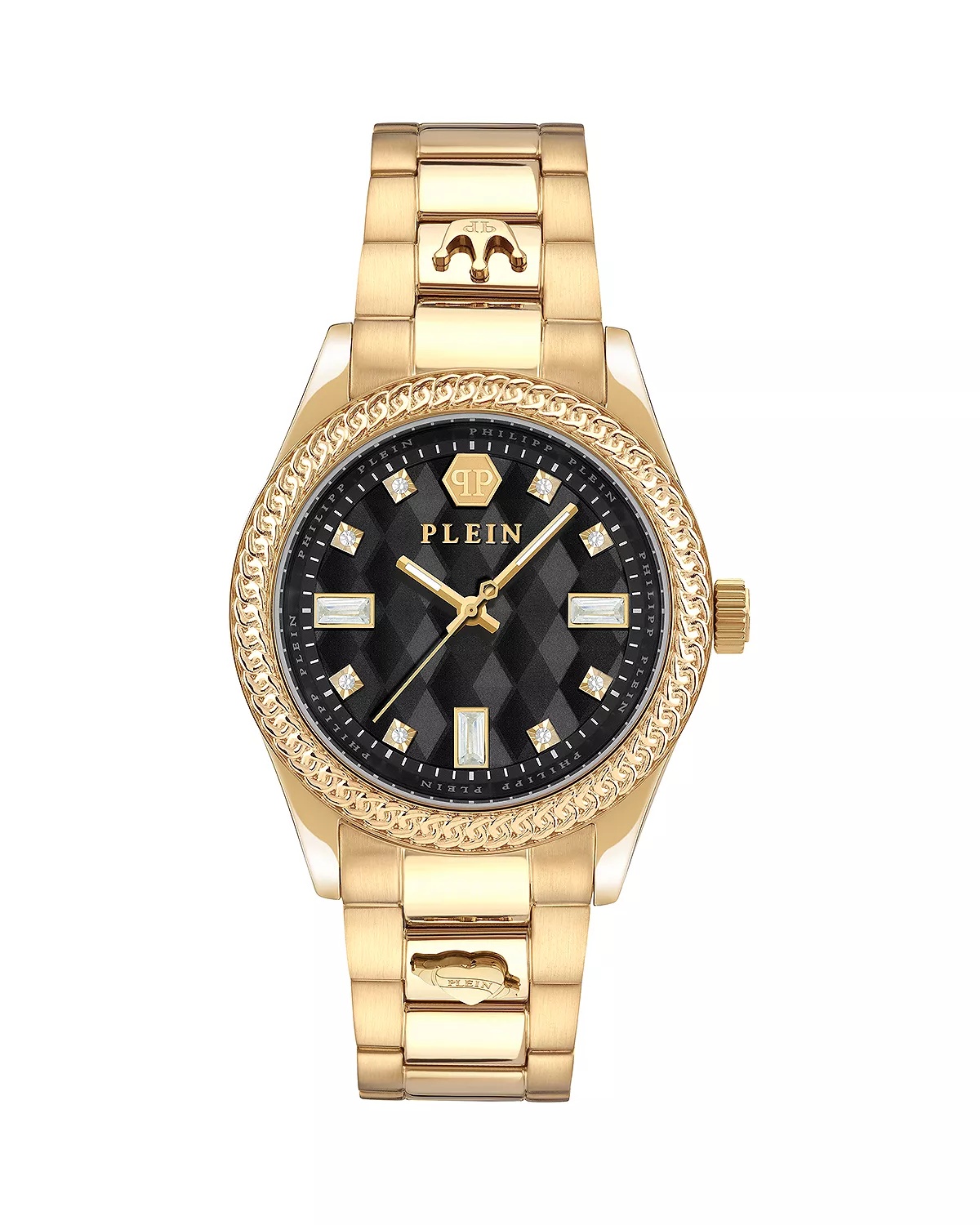 PRODUCT DETAILS - Yellow gold IP; stainless steel; Preciosa crystals; mineral crystal - Case size: 38mm - Deployant clasp closure - Water resistant to 5 ATM - Quartz movement - Black dial with crystal markers - Gold stainless steel link bracelet - Manufacturer's 2-year limited warranty - Photo may have been enlarged and/or enhanced - Imported Web ID: 5246847