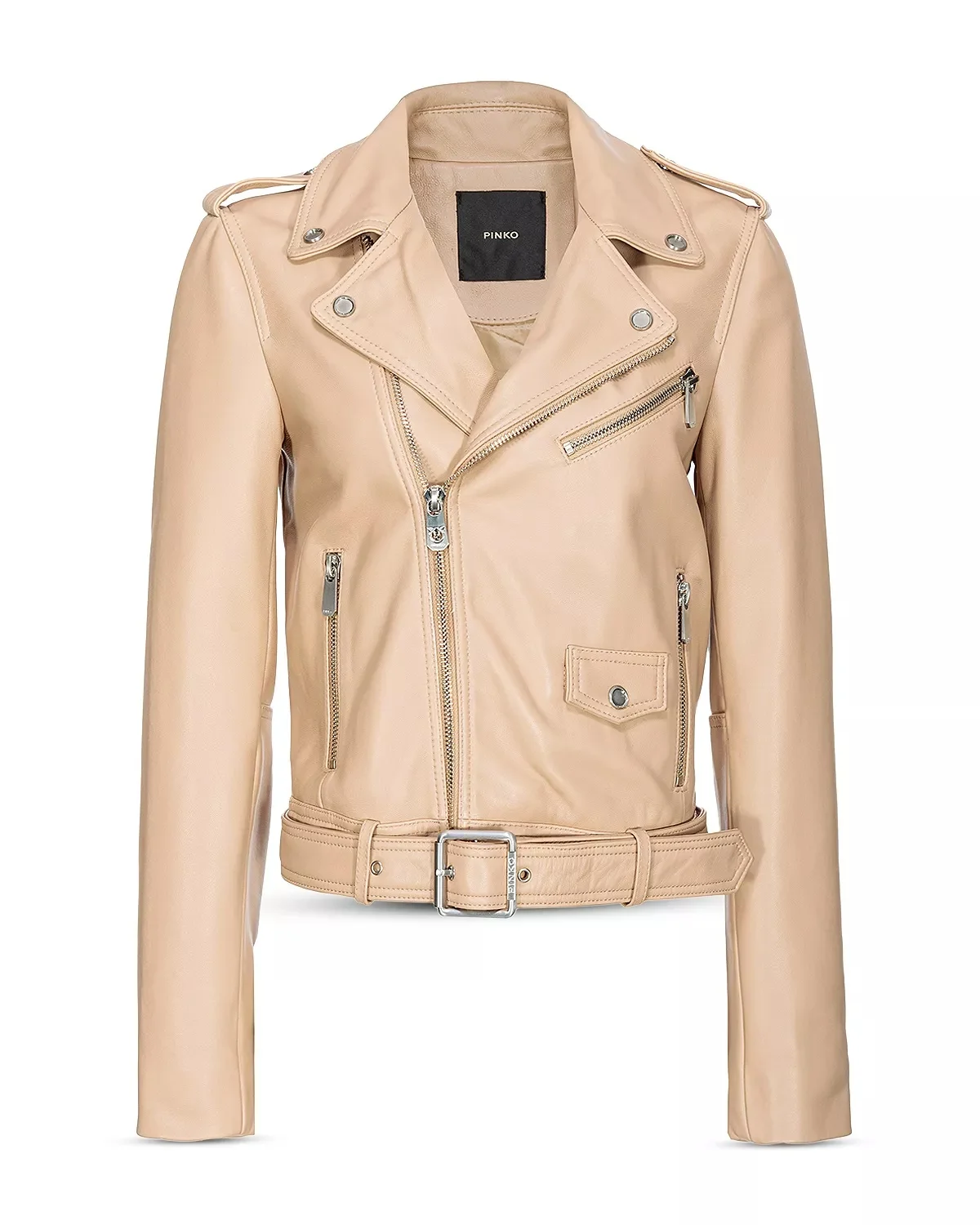 SIZE & FIT - Fits true to size, order your normal size - Model measurements: 5'10" height, 33.5" bust, 23.5" waist, 34.5" hips, wearing a size 40 PRODUCT DETAILS - Notch lapels - Long sleeves, epaulets at shoulders - Zipper cuffs - Front asymmetric zipper - Two front zipper pockets, one left chest zipper pocket, one front coin pocket - Adjustable belt at hem, belt loops - Made in India Web ID: 5475960 MATERIAL & CARE - Leather; lining: 100% polyester - Professional leather clean
