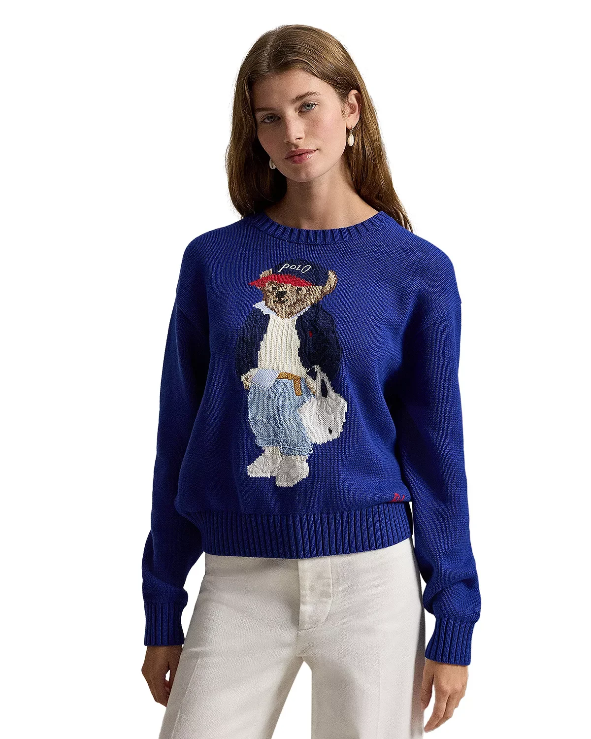 SIZE & FIT - Designed for a relaxed fit; hits at the hip - 23" body length, 22.5" sleeve length, based on a size medium - Body length is taken from the high point of the shoulder; sleeve length changes 0.5" between sizes - Model measurements: 5'10" height, wearing a size small PRODUCT DETAILS - Crewneck - Drop shoulders, long sleeves - Pullover style - Front intarsia-knit and embroidered Polo Bear donning a signature on-brand look - "RL" cross-stitched at left hem - Ribbed trim at neck, cuffs, and hem - Imported Web ID: 5906126 MATERIAL & CARE - 100% cotton - Hand wash or dry clean