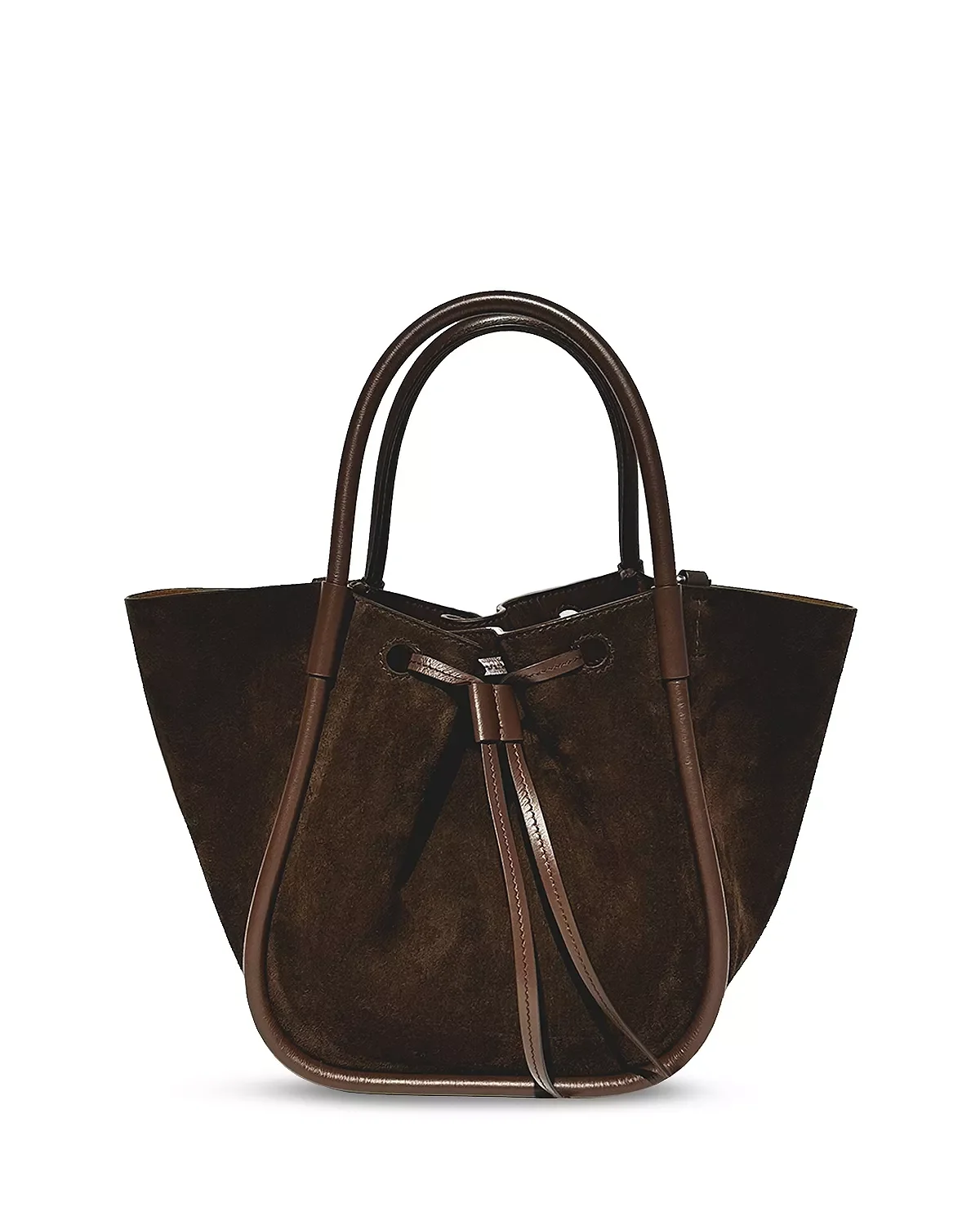 PRODUCT DETAILS - Double handles - Dimensions: 13.4"W x 6.5"D x 9.05"H - Drawstring closure - Logo on front - Lined - Suede; lining: 100% polyester - Made in Italy Web ID: 5700872