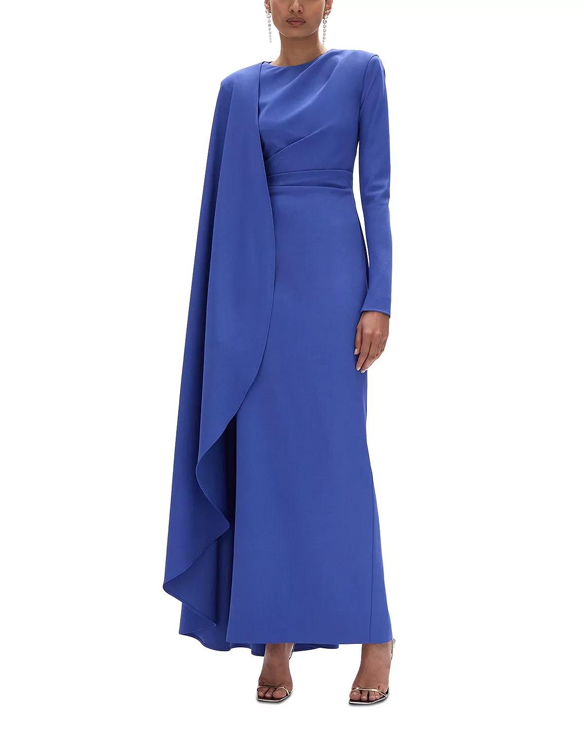 SIZE & FIT - Fits true to size, order your normal size - Fitted at the bust, waist, and hip - Non-stretch fabric - Designed for a floor-length look - Approx. 62" from high point shoulder to hem, based on a size 1/US 4 - Model measurements: 5'9.5" height, wearing a size 1/US 4 PRODUCT DETAILS - Round neck - Long sleeves - Cascading cape detail from right shoulder to hem - Hand-draped ruching at right side waist - Back zip closure - Lined - Imported Web ID: 5821634 MATERIAL & CARE - 96% polyester/4% polyurethane; lining: 100% polyester - Dry clean