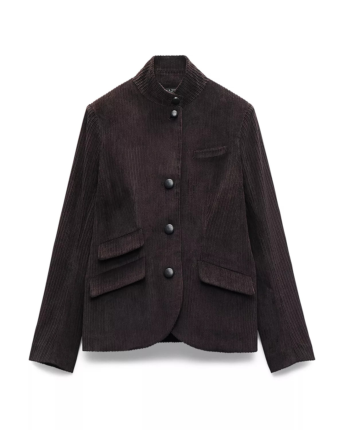 SIZE & FIT - Fits true to size, order your normal size - Designed for a slim fit - Approx. 25.5" from high point of shoulder to hem, 36.5" chest, 32.5" sleeve length, based on a size 4 PRODUCT DETAILS - Stand collar - Long sleeves with button cuffs - Front button closures - One welt pocket at chest and three welt pockets with flaps at hip - Corduroy fabrication - Imported Web ID: 5593393 MATERIAL & CARE - Polyester/polyamide/elastane; lining: viscose/polyester - Dry clean