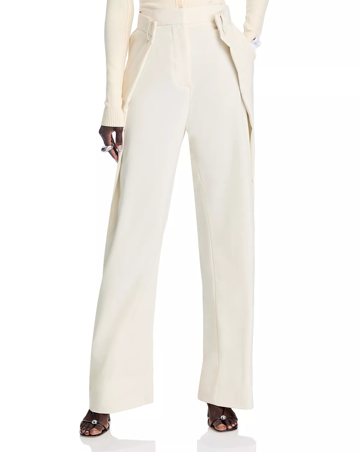 SIZE & FIT - Fits true to size, order your normal size - 11" rise, 15" inseam, 32" leg opening, based on a size 34 FR/extra small - Model measurements: 5'10" height PRODUCT DETAILS - Banded waist, belt loops - Zip fly with concealed button closure - Pleated detail at sides - Wide-leg silhouette - Please note: ruffled belt not included - Imported Web ID: 5437284 MATERIAL & CARE - 56% polyester/ 24% rayon/18% wool/2% spandex elastane - Dry clean