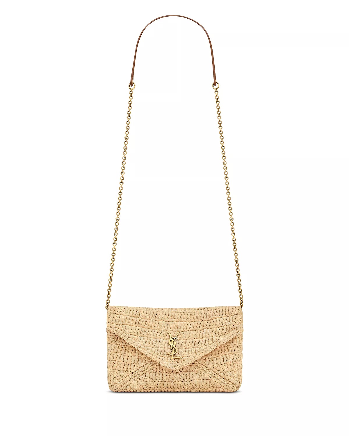 PRODUCT DETAILS - Dimensions: 7.5" W x 1.2" L x 4.7" H - Magnetic closure - One main pocket compartment - Saint Laurent returns and exchanges of full-price merchandise are only accepted online and at Saint Laurent Accessory Boutiques at Bloomingdale's, including 59th St., Roosevelt Field, Century City, Valley Fair, Glendale, and South Coast Plaza. - 80% Raffia 20% Brass - Made in Italy Web ID: 5630784