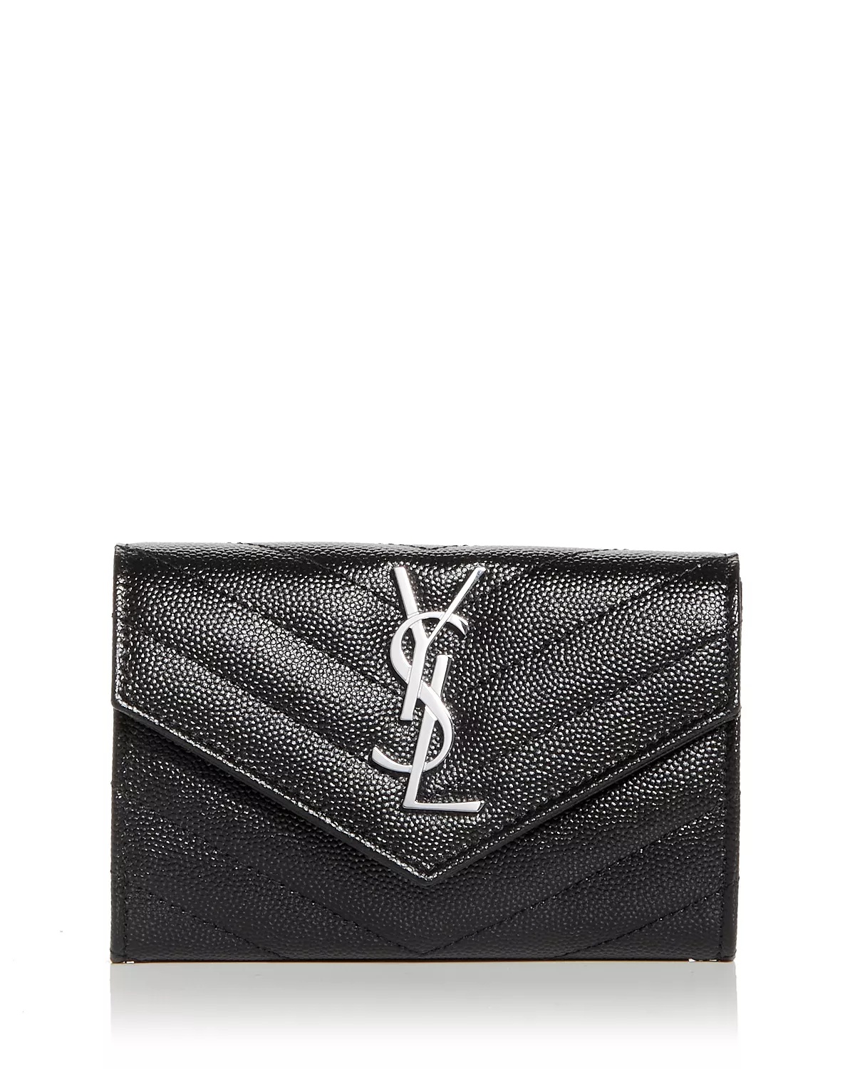 PRODUCT DETAILS - Dimensions: 5.3"W x 1.1"D x 3.7"H - Snap flap closure - Exterior slip pocket, four interior card slots - Quilted chevron detailing at front and back - Gold-tone, silver-tone, or black hardware - Logo hardware at front - Lined - Saint Laurent returns and exchanges of full-price merchandise are only accepted online and at Saint Laurent Accessory Boutiques at Bloomingdale's, including 59th St., Roosevelt Field, Century City, Valley Fair, Glendale, and South Coast Plaza. - Leather - Made in Italy Web ID: 4165981