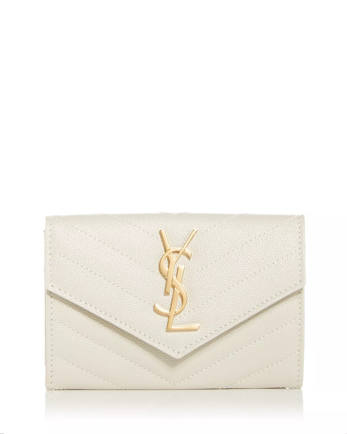 PRODUCT DETAILS - Dimensions: 5.3"W x 1.1"D x 3.7"H - Snap flap closure - Exterior slip pocket, four interior card slots - Quilted chevron detailing at front and back - Gold-tone, silver-tone, or black hardware - Logo hardware at front - Lined - Saint Laurent returns and exchanges of full-price merchandise are only accepted online and at Saint Laurent Accessory Boutiques at Bloomingdale's, including 59th St., Roosevelt Field, Century City, Valley Fair, Glendale, and South Coast Plaza. - Leather - Made in Italy Web ID: 4165981