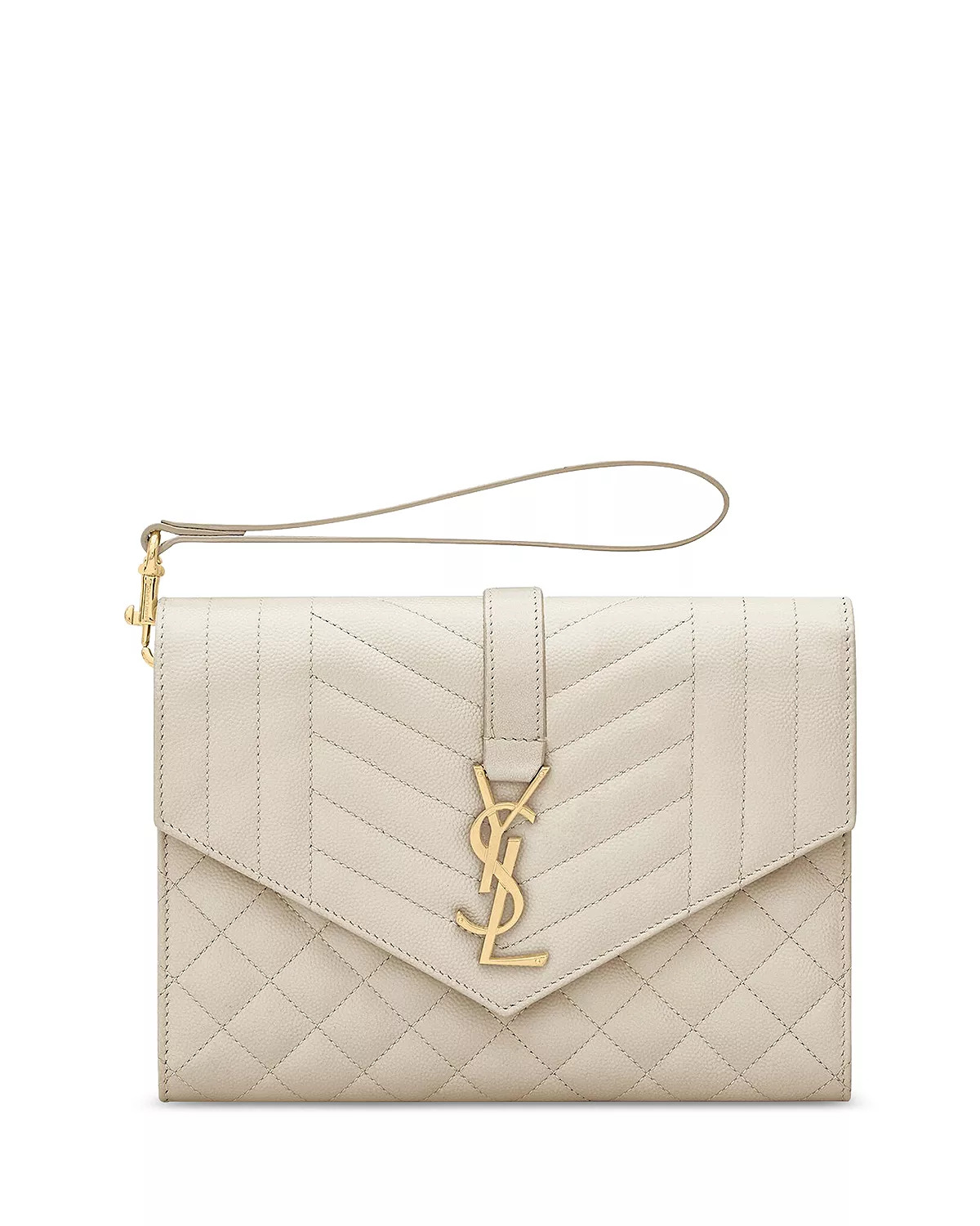 PRODUCT DETAILS - 8.2"W x 6.2"D x 1.1"H - Snap-button closure - Interior: one main compartment, one flat pocket - Saint Laurent returns and exchanges of full-price merchandise are only accepted online and at Saint Laurent Accessory Boutiques at Bloomingdale's, including 59th St., Roosevelt Field, Century City, Valley Fair, Glendale, and South Coast Plaza. - 90% Calfskin leather, 10% Brass - Made in Italy Web ID: 4493851