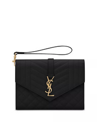 PRODUCT DETAILS - 8.2"W x 6.2"D x 1.1"H - Snap-button closure - Interior: one main compartment, one flat pocket - Saint Laurent returns and exchanges of full-price merchandise are only accepted online and at Saint Laurent Accessory Boutiques at Bloomingdale's, including 59th St., Roosevelt Field, Century City, Valley Fair, Glendale, and South Coast Plaza. - 90% Calfskin leather, 10% Brass - Made in Italy Web ID: 4493851