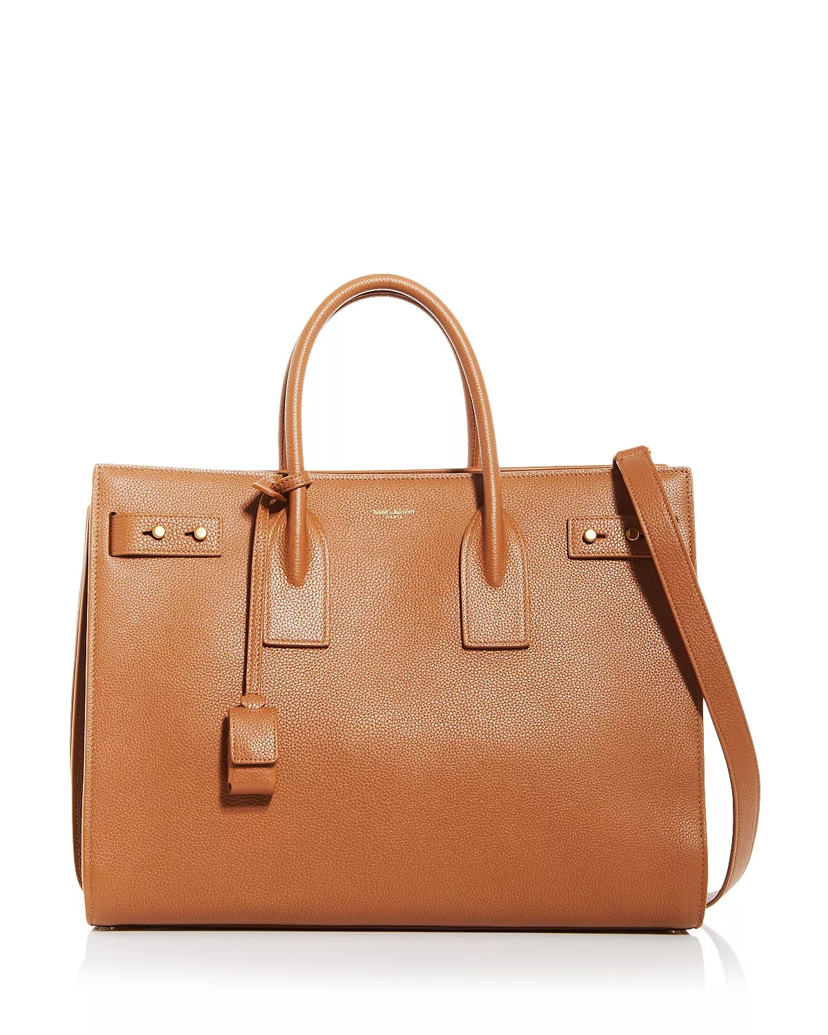 PRODUCT DETAILS - Removable adjustable shoulder strap, 18" drop - Double handles, 4" drop - Dimensions: 15"W x 7"D x 11.25"H - Open top - Interior removable zip pouch, divides bag into two compartments - Gusseted sides - Adjustable strap details at gussets - Gold-tone hardware - Removable logo padlock at handles, padlock key at interior - Protective metal feet - Logo at front - Suede lining - Saint Laurent returns and exchanges of full-price merchandise are only accepted online and at Saint Laurent Accessory Boutiques at Bloomingdale's, including 59th St., Roosevelt Field, Century City, Valley Fair, Glendale, and South Coast Plaza. - Leather - Made in Italy Web ID: 4450636