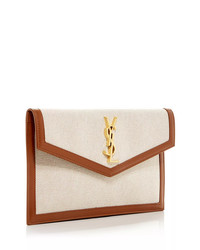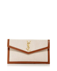 PRODUCT DETAILS - 10.6"W x 6.2"D x 0.7"H - Magnetic Snap Closure - One main interior compartment - Saint Laurent returns and exchanges of full-price merchandise are only accepted online and at Saint Laurent Accessory Boutiques at Bloomingdale's, including 59th St., Roosevelt Field, Century City, Valley Fair, Glendale, and South Coast Plaza. - Leather, cotton canvas, or raffia - Made in Italy Web ID: 5608829
