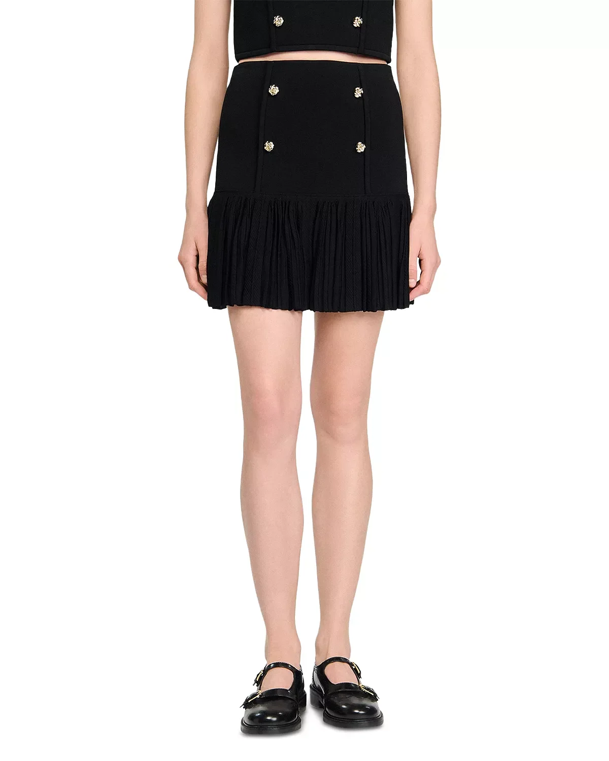 SIZE & FIT - Fits true to size, order your normal size - Approx. length: 17", based on a size 36 - Model measurements: 5'10" height, 33.5" bust, 23.5" waist, 34.5" hips, wearing a Sandro size 1 or 36 PRODUCT DETAILS - Side zip closure - Mini silhouette - Double-breasted design with gold-tone buttons - Ruffle hem - Please note that this merchandise will be delivered with a branded return tag attached. If the branded return tag is removed, the merchandise cannot be returned. - Imported Web ID: 5632941 MATERIAL & CARE - 54% viscose/44% polyamide/2% elastane; lining: 55% viscose/44% polyamide/1% elastane - Hand wash or dry clean