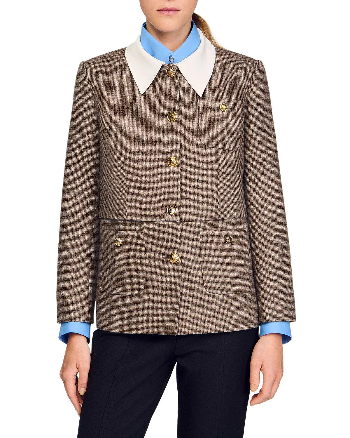 SIZE & FIT - Fits true to size, order your normal size - Designed for a straight fit - 26" length, 23" sleeve length, based on a size 36 PRODUCT DETAILS - Removable contrasting shirt collar - Long sleeves - Front button closures - Houndstooth pattern - Buttoned patch pockets at chest and sides - Lined - Please note that this merchandise will be delivered with a branded return tag attached. If the branded return tag is removed, the merchandise cannot be returned. - Imported Web ID: 5665539 MATERIAL & CARE - 60% virgin wool/38% polyester/2% elastane; lining: 100% viscose; removable collar: 100% viscose; pocket lining: 100% cotton - Dry clean