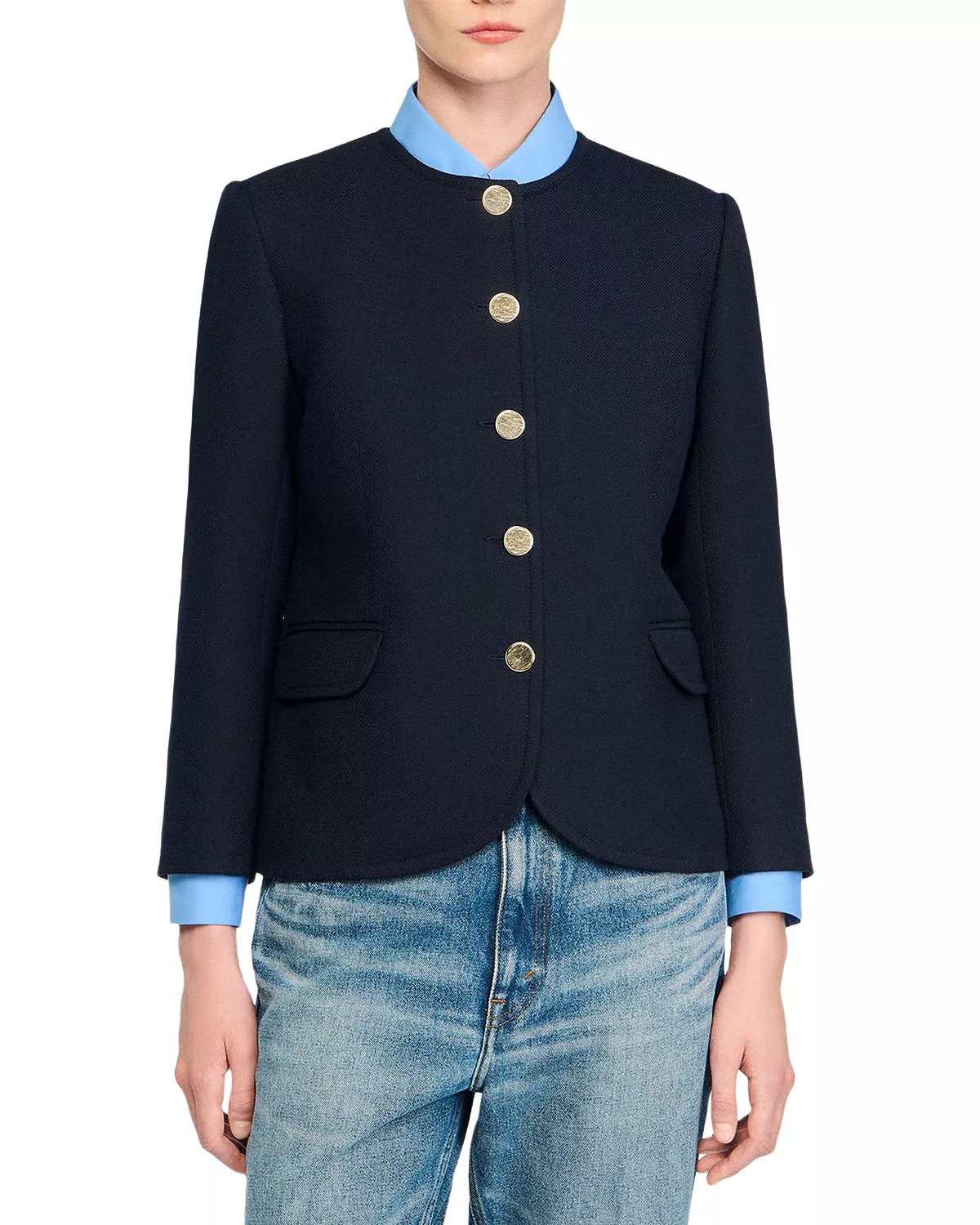SIZE & FIT - Fits true to size, order your normal size - Designed for a straight cut - 24" length, 23" sleeve length, based on a size 36 PRODUCT DETAILS - Round collar - Long sleeves - Front button closures - Rounded hem - Welt pockets with rounded flaps - Lined - Please note that this merchandise will be delivered with a branded return tag attached. If the branded return tag is removed, the merchandise cannot be returned. - Imported Web ID: 5658077 MATERIAL & CARE - 65% polyester/35% viscose; lining: 100% viscose; pocket lining: 100% cotton - Dry clean