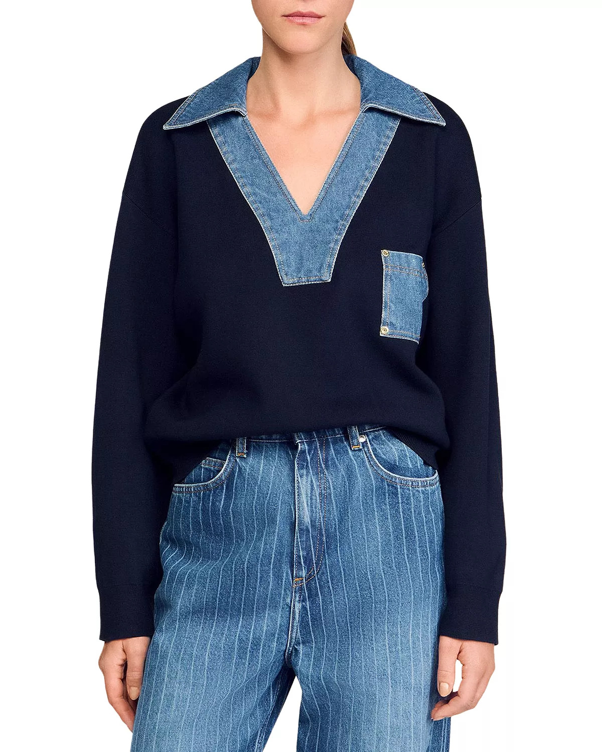 SIZE & FIT - Fits true to size, order your normal size - 23" length, based on a size 1 PRODUCT DETAILS - Contrasting V-neck in denim - Long sleeves - Pullover style - Ribbed edges - Fine knit - Patch pocket in denim - Please note that this merchandise will be delivered with a branded return tag attached. If the branded return tag is removed, the merchandise cannot be returned. - Imported Web ID: 5632987 MATERIAL & CARE - 62% viscose/24% polyester/14% polyamide; collar: 61% cotton/23% polyester/8% viscose/4% acrylic/4% polyamide; rib: 66% viscose/25% polyester/9% polyamide - Hand wash or dry clean
