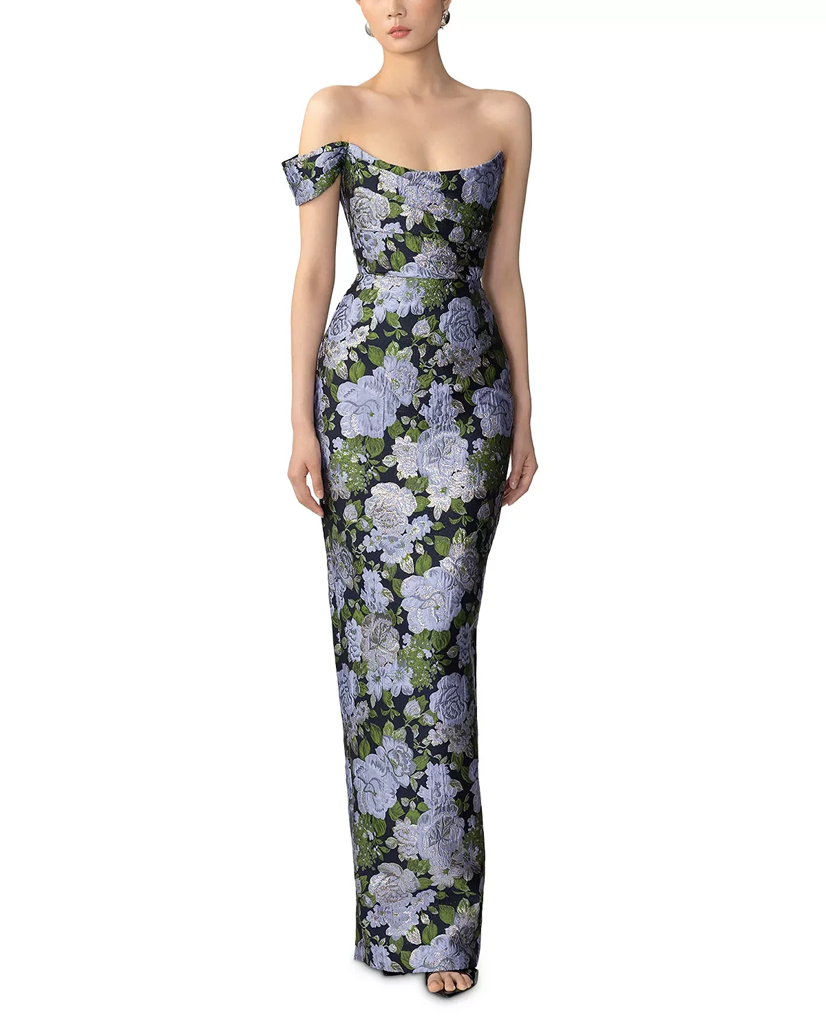 SIZE & FIT - Fits true to size, order your normal size - Fitted at bust, waist and hips - Non-stretch fabric - Designed for a floor-length look - Approx. 63" from high point shoulder to hem, based on a size 4 - Model is wearing size 4 PRODUCT DETAILS - Scoop bandeau neck - One off-the-shoulder strap - Back zipper closure - Metallic floral jacquard fabric - Pleated front bodice - Slit at back hem - Lined - Imported Web ID: 5783124 MATERIAL & CARE - Shell: 100% polyester; lining: 97% polyester/3% spandex - Dry clean