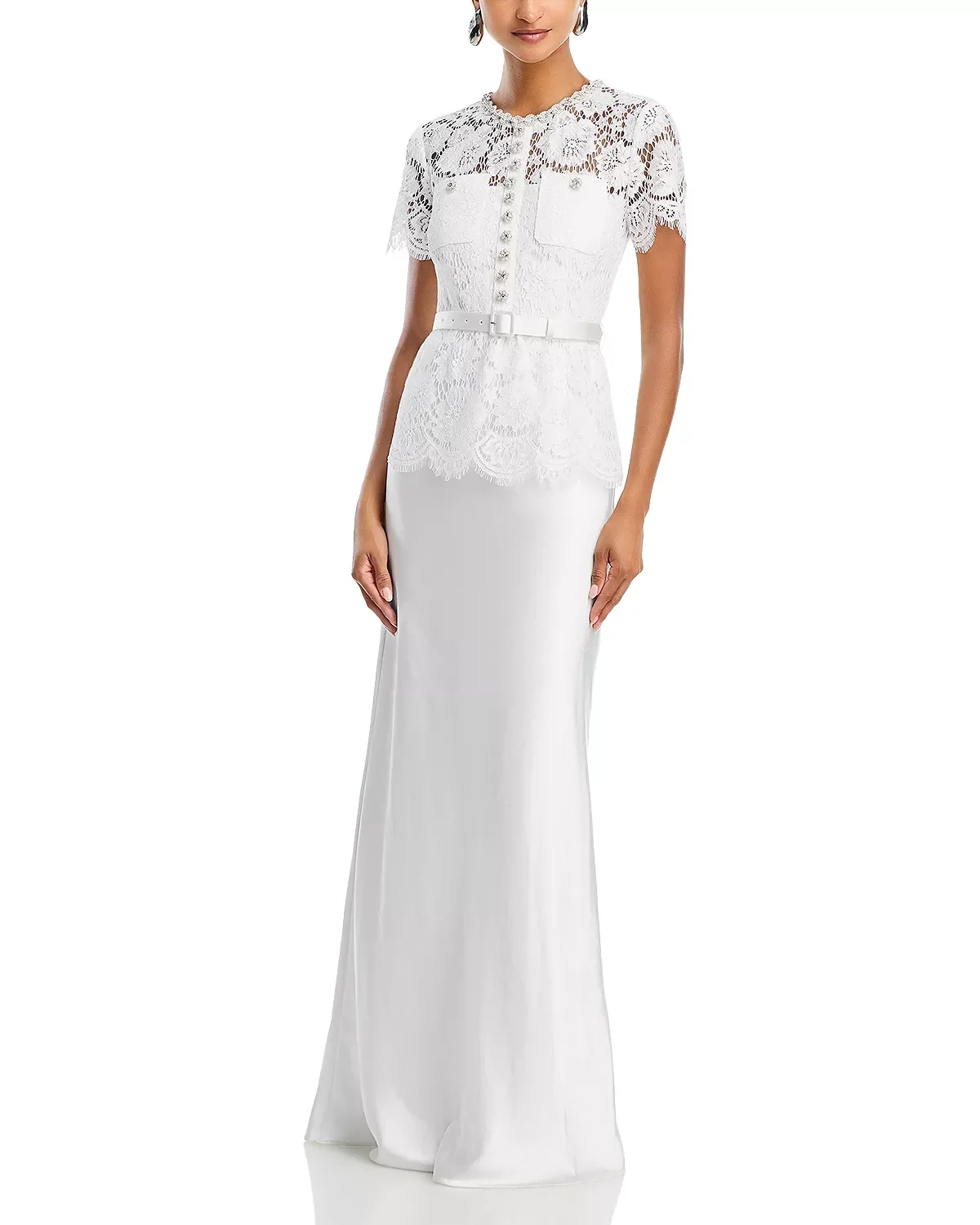 SIZE & FIT - Runs small; if between sizes, order one size up - Fitted throughout - Non-stretch fabric - Designed for a floor-length look - Approx. 62.205" length, based on size 8 UK or 4 US - Model measurements: 5'10" height, 33.5" bust, 23.5" waist, 34.5" hips, wearing a size 8 UK or 4 US PRODUCT DETAILS - Embellished high neck - Short sleeves - Front button closures, back zip closure - White lace bodice, satin skirt - Waist belt - Lined - Imported Web ID: 5697371 MATERIAL & CARE - Polyester; fabric 2: polyamide/cotton/viscose - Dry clean