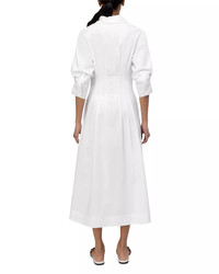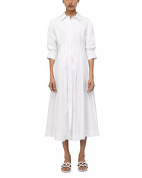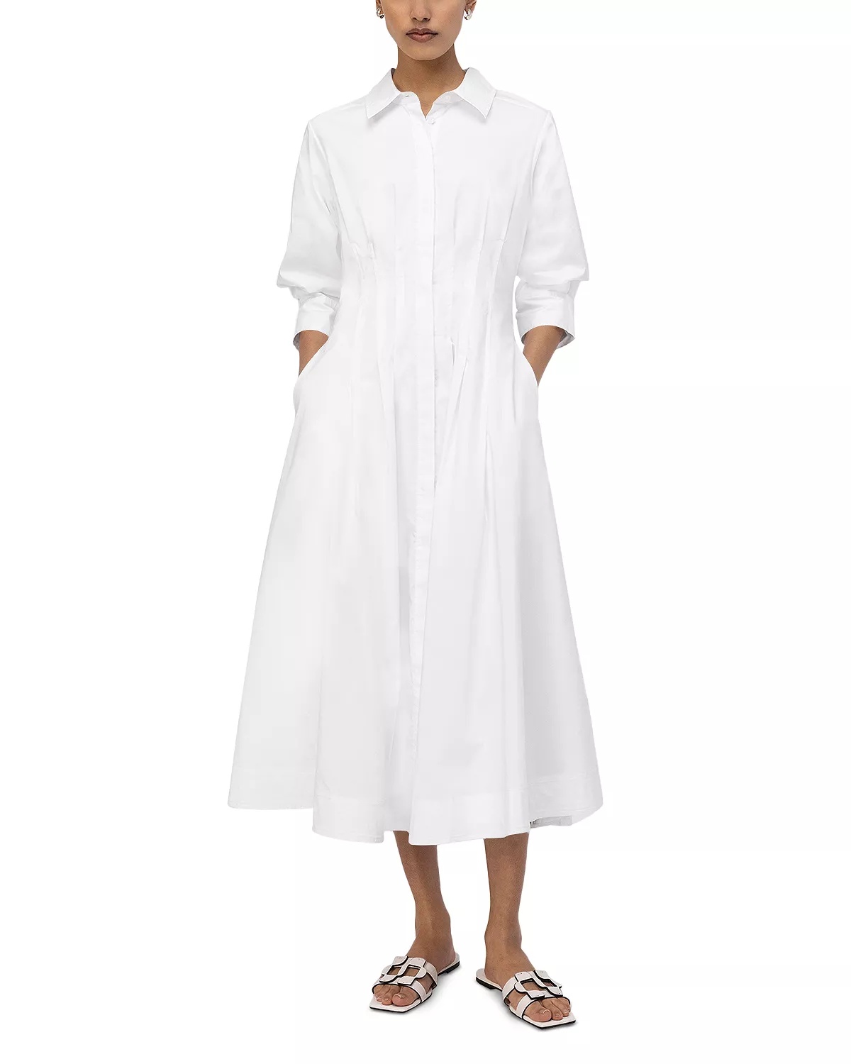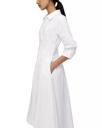 SIZE & FIT - Fits true to size, order your normal size - Body-skimming fit through the bust, fitted waist, flared through the hips - Designed to hit at mid calf - Approx. 50" from back of neck to hem, based on a size small - Model measurements: 5'10" height, 33.5" bust, 23.5" waist, 34.5" hips, wearing a size small PRODUCT DETAILS - Spread collar - Front placket with button closures - Three-quarter-length sleeves, buttoned cuffs - On-seam hip pockets - Fit & flare silhouette - Pintucked pleats at waist and hips - Lined - Please note that this dress will be delivered with a black b-tag attached, with instructions for removal included. If the b-tag is removed, the dress cannot be returned. - Imported Web ID: 5006904 MATERIAL & CARE - 63% cotton/37% polyester; lining: 82% rayon/18% nylon - Dry clean