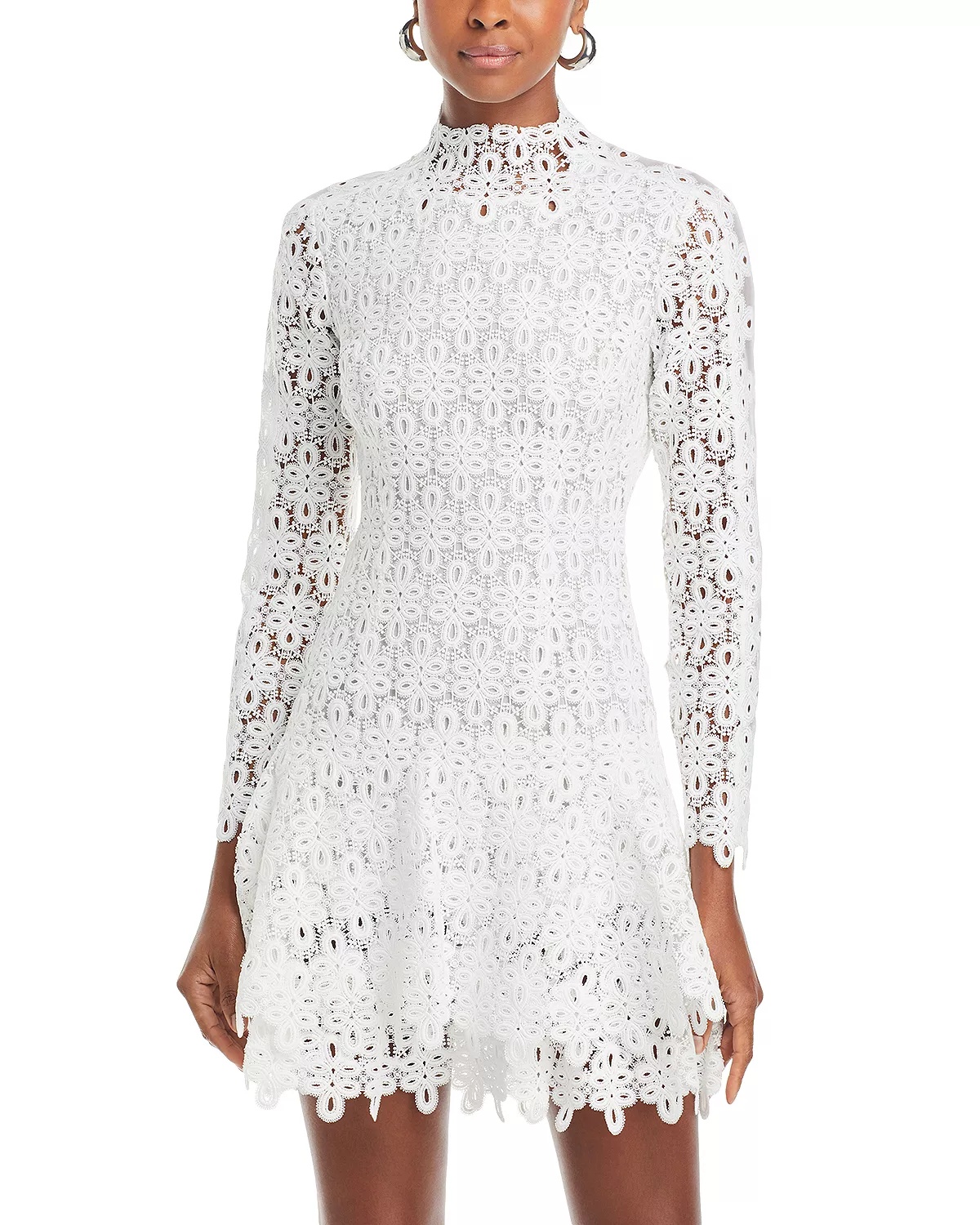 SIZE & FIT - Fits true to size, order your normal size - Fitted through bust, waist and hips - Designed to hit above the knee - Approx. 36" from high point shoulder to hem, based on a size 4 - Model measurements: 5'10" height, 33.5" bust, 23.5" waist, 34.5" hips, wearing a size 4 PRODUCT DETAILS - Mock neck - Long sleeves - Center back zip closure - Mini silhouette - Allover lace fabrication - Scalloped hemline - Lined - Please note that this dress will be delivered with a black b-tag attached, with instructions for removal included. If the b-tag is removed, the dress cannot be returned. - Imported Web ID: 4816122