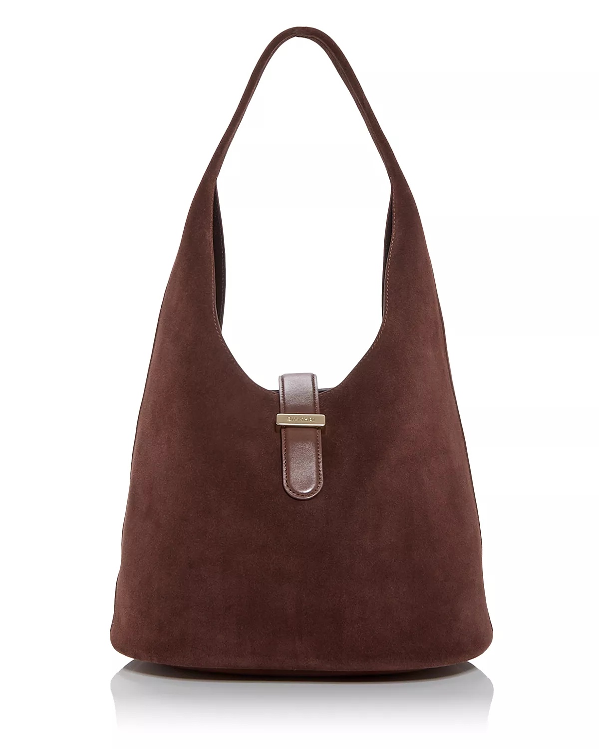 PRODUCT DETAILS - Shoulder strap, 9" drop - Dimensions: 12.5"W x 5.5"D x 8.5"H - Open top with magnetic tab closure - Three interior card slots - Logo at closure - Gold-tone hardware - Mannequin model measurements: 5'10" height, wearing a size 4 or small - Leather lining - Suede - Imported Web ID: 5196311