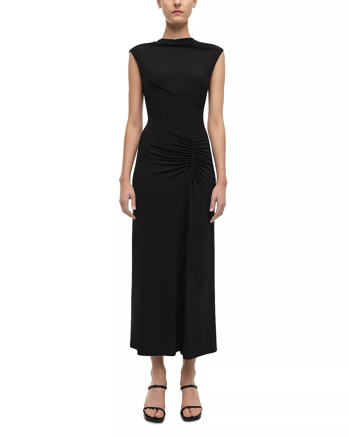 SIZE & FIT - Fits true to size, order your normal size - Designed to hit at mid calf - Approx. 52" from high point shoulder to hem, based on a size small - Model measurements: 5'10" height, 33" bust, 25" waist, 35" hips, wearing a size small PRODUCT DETAILS - High drape neck - Sleeveless - Pullover style - Gather front detail - Lined - Please note that this dress will be delivered with a black b-tag attached, with instructions for removal included. If the b-tag is removed, the dress cannot be returned. - Imported Web ID: 5412492 MATERIAL & CARE - 96% rayon/4% spandex; lining: 94% rayon/6% spandex - Dry clean