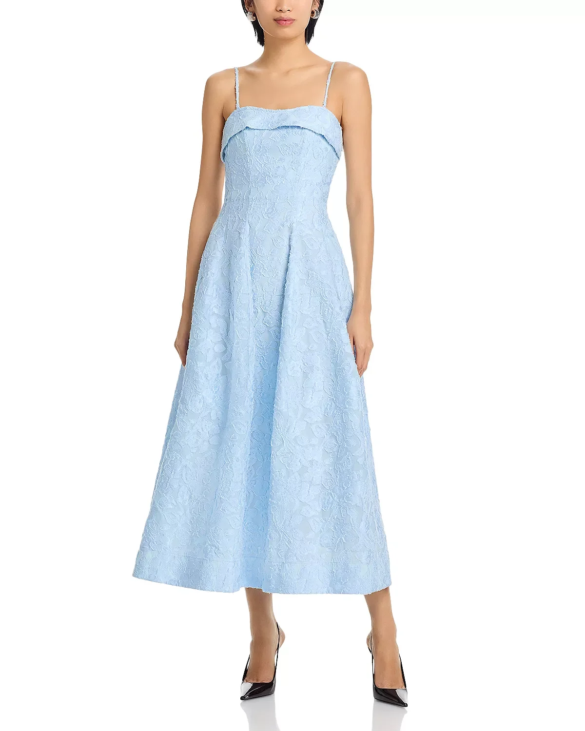 SIZE & FIT - Fits true to size, order your normal size - Fitted at bust and waist, relaxed at the hips - Designed to hit at mid calf - Approx. 47" length PRODUCT DETAILS - Straight foldover neckline - Adjustable spaghetti straps - Back zip closure - Midi silhouette - Jacquard fabrication - Lined - Imported Web ID: 5889604 MATERIAL & CARE - Shell, contrast & lining: 100% polyester - Dry clean