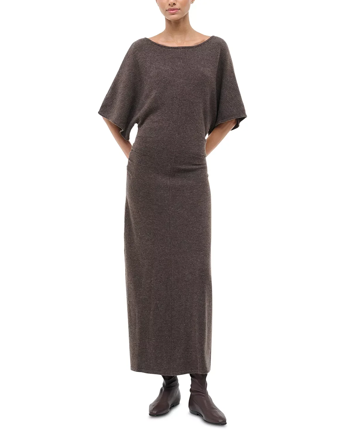 SIZE & FIT - Fits true to size, order your normal size - Designed to hit at the ankle - Approx. 54" length PRODUCT DETAILS - Boat neck - Elbow dolman sleeves - Front center seam detail - Ruched at low back - Pullover style - Imported Web ID: 5794323 MATERIAL & CARE - 51% wool/49% nylon - Dry clean