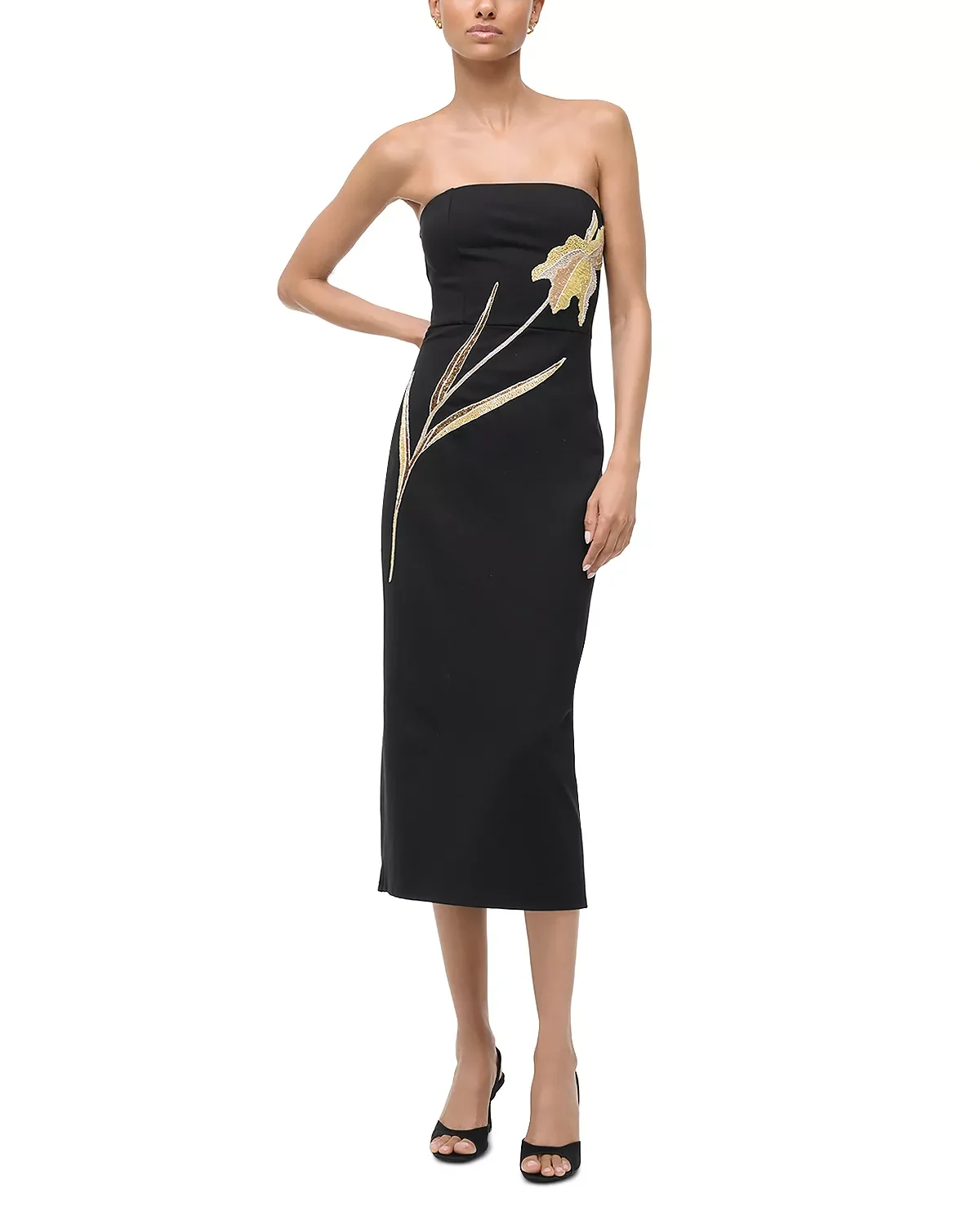 SIZE & FIT - Fits true to size, order your normal size - Fitted at bust, waist and hips - Designed to hit at mid-calf - Approx. 50" long - Model measurements: 5'10" height, wearing a size small PRODUCT DETAILS - Bandeau neck - Strapless - Back zipper closure - Embroidered and embellished flower at front - Lined - Made in India Web ID: 5728886 MATERIAL & CARE - Shell: 68% viscose/27% nylon/5% elastane; lining: 80% nylon/20% elastane; embroidery: 90% glass beads/10% polychlorurede vinyl - Dry clean