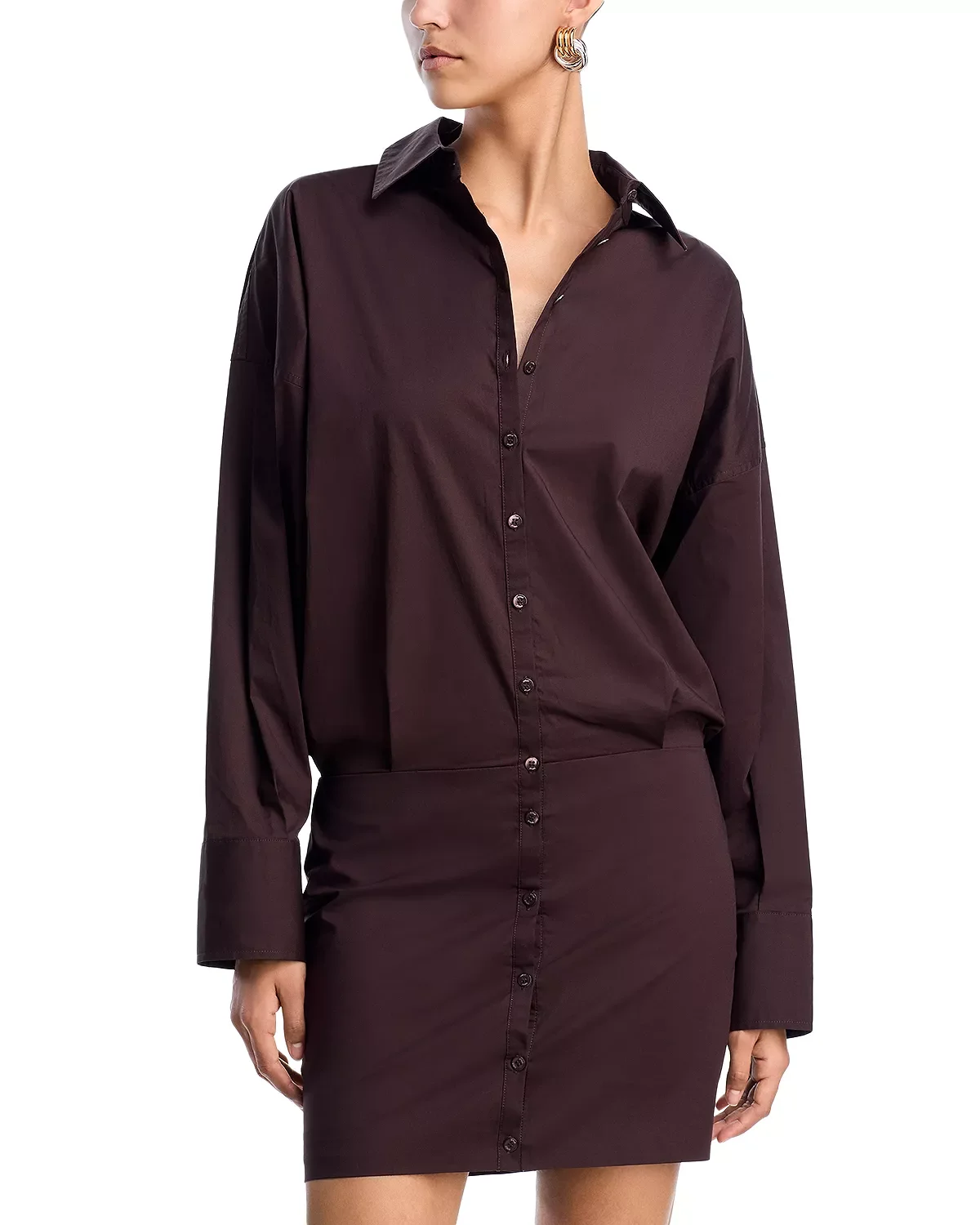 SIZE & FIT - Fits true to size, order your normal size - Designed for a mini length - Approx. 35" long from high point shoulder to hem - Model measurements: 5'10" height, wearing a size small PRODUCT DETAILS - Point collar - Long sleeves - Front button closures - Lined - Imported Web ID: 5610420 MATERIAL & CARE - Shell: 98% cotton/2% spandex; lining: 100% cotton - Dry clean