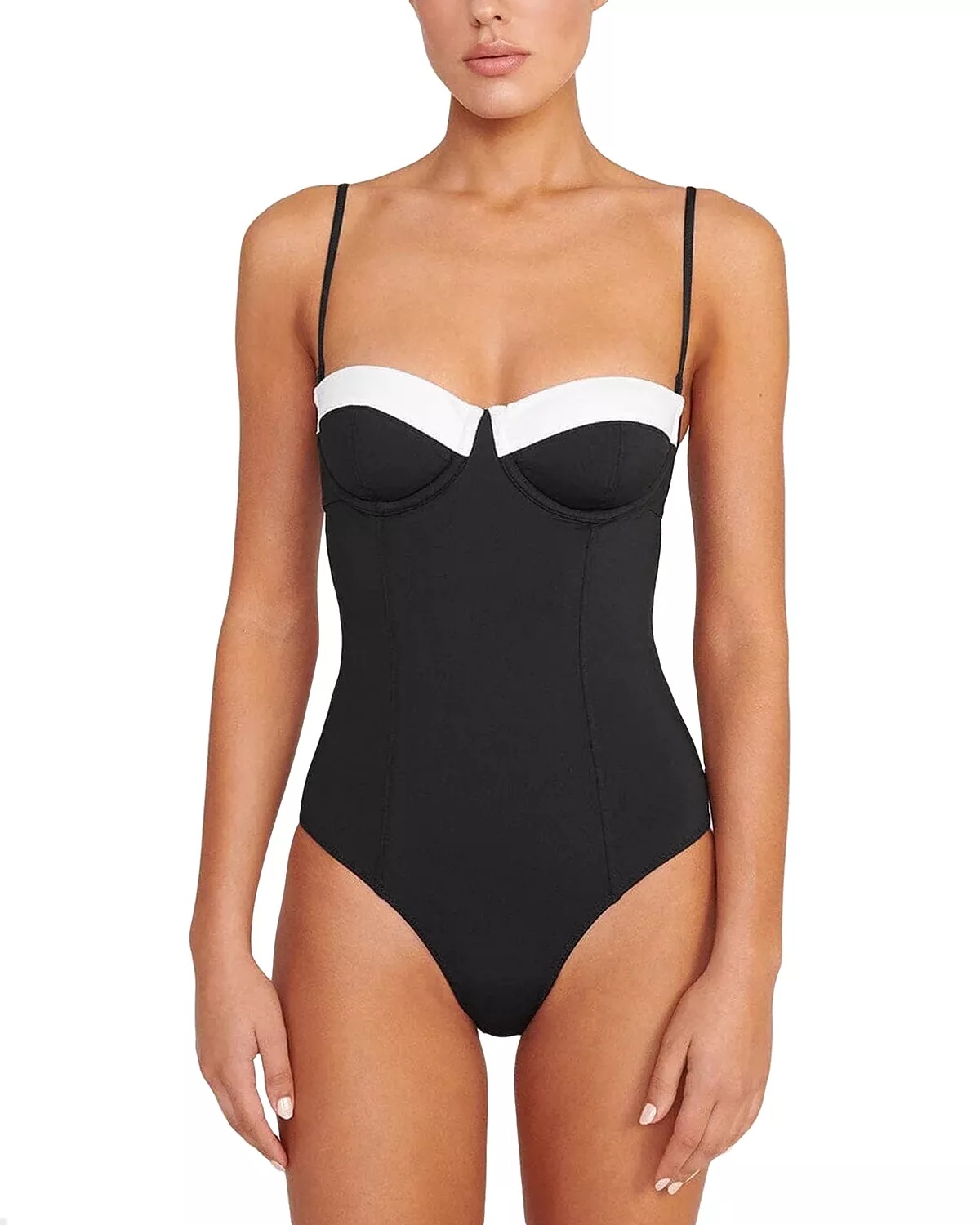 SIZE & FIT - Swimwear sizing fits smaller than apparel sizing, order one size up for more coverage - Approx. 27" length from shoulder, based on a size small PRODUCT DETAILS - Sweetheart neck - Removable straps - Trim at cups, front seaming detail - Back hook closure - Underwire - Removable bust padding - Moderate bottom coverage - Water resistant - Back cutout - Lined - Staud Swim is exclusively available in store at Bloomingdale's 59th Street, Aventura, and Short Hills locations - Imported Web ID: 5531922 MATERIAL & CARE - Main: 82% nylon/18% spandex; trim: 67% polyester/33% spandex; lining: 82% nylon/18% spandex - Dry clean