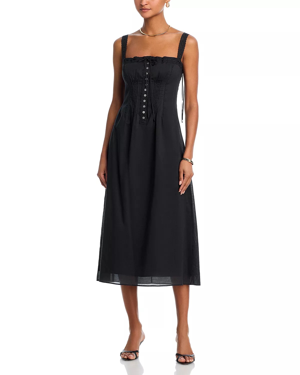 SIZE & FIT - Fits true to size, order your normal size - Designed to hit ad mid calf - Approx. 50" from high point shoulder to hem, based on size small - Model measurements: 5'10" height, wearing a size small PRODUCT DETAILS - Square neck - Sleeveless - Buttons at front - Concealed zipper at center back - Grosgrain ribbon threaded through lace trim at neckline and straps - Lace trim at placket and side front seams - Pintucks at bodice front - Lined - Imported Web ID: 5474364 MATERIAL & CARE - 100% cotton; lining: 100% cotton - Dry clean