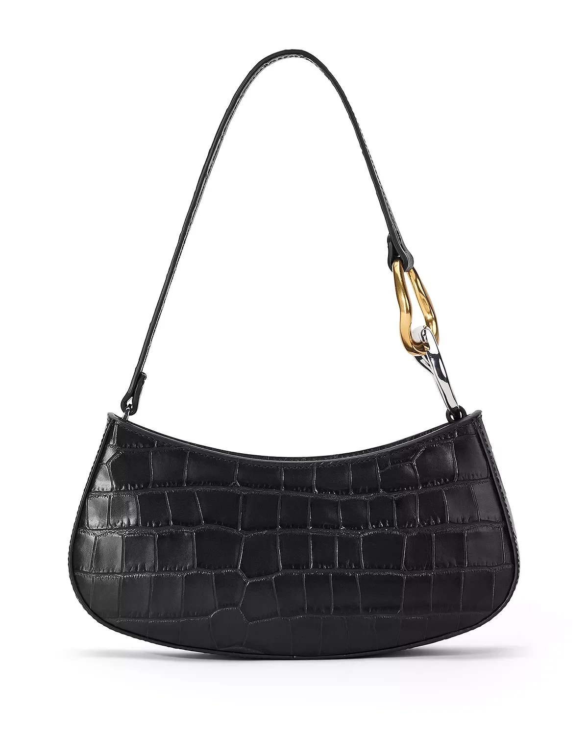 PRODUCT DETAILS - Shoulder strap, 8" drop - Dimensions: 9.5"W x 2"D x 5"H - Top zip closure - Interior zip pocket - Silver-tone hardware - Gold-tone and silver-tone sculptural hardware detail at strap - Logo at front - Mannequin model measurements: 5'10" height, wearing a size 4 or small - Fabric lining - Leather or suede - Imported Web ID: 5744102