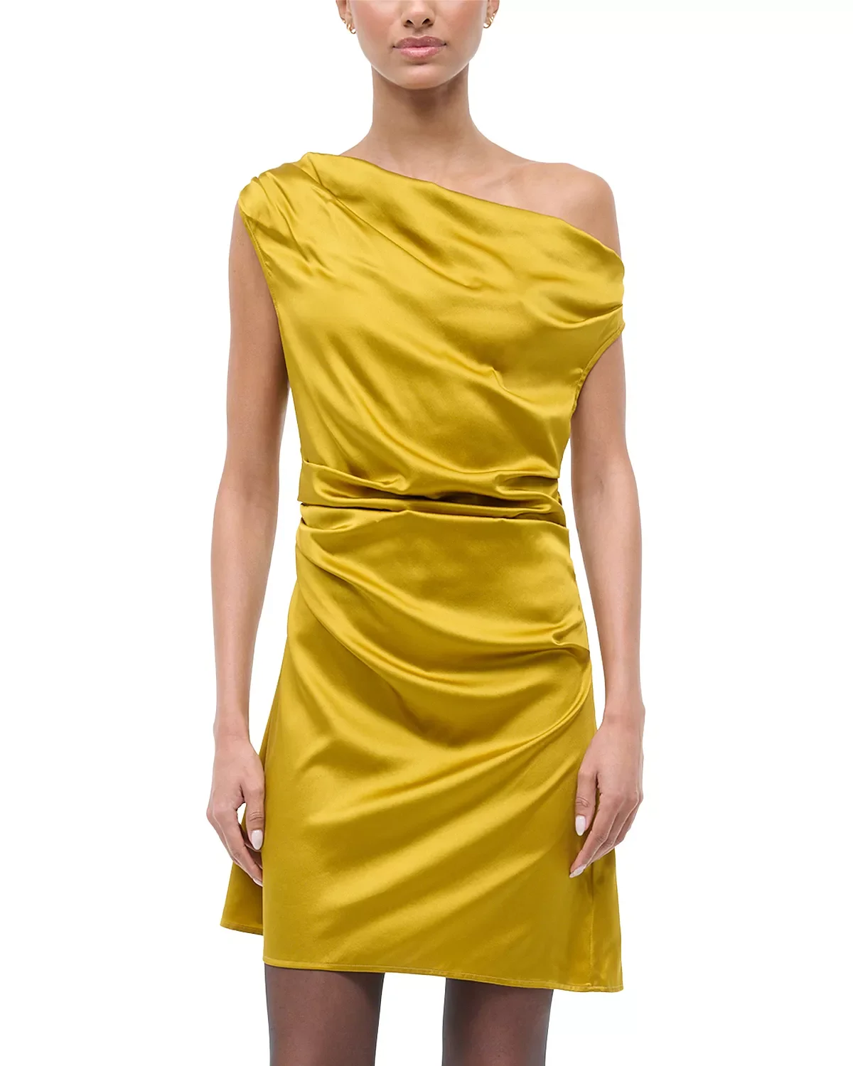 SIZE & FIT - Fits true to size, order your normal size - Designed for a mini length - Approx. 34" length, based on size 0 - Model measurements: 5'10" height, 33.5" bust, 23.5" waist, 34.5" hips, wearing a size 0 PRODUCT DETAILS - Asymmetric neckline - One-shoulder design - Side zip closure - Soft ruching detail throughout the bodice - Imported Web ID: 5745568 MATERIAL & CARE - 93% silk/7% spandex - Dry clean