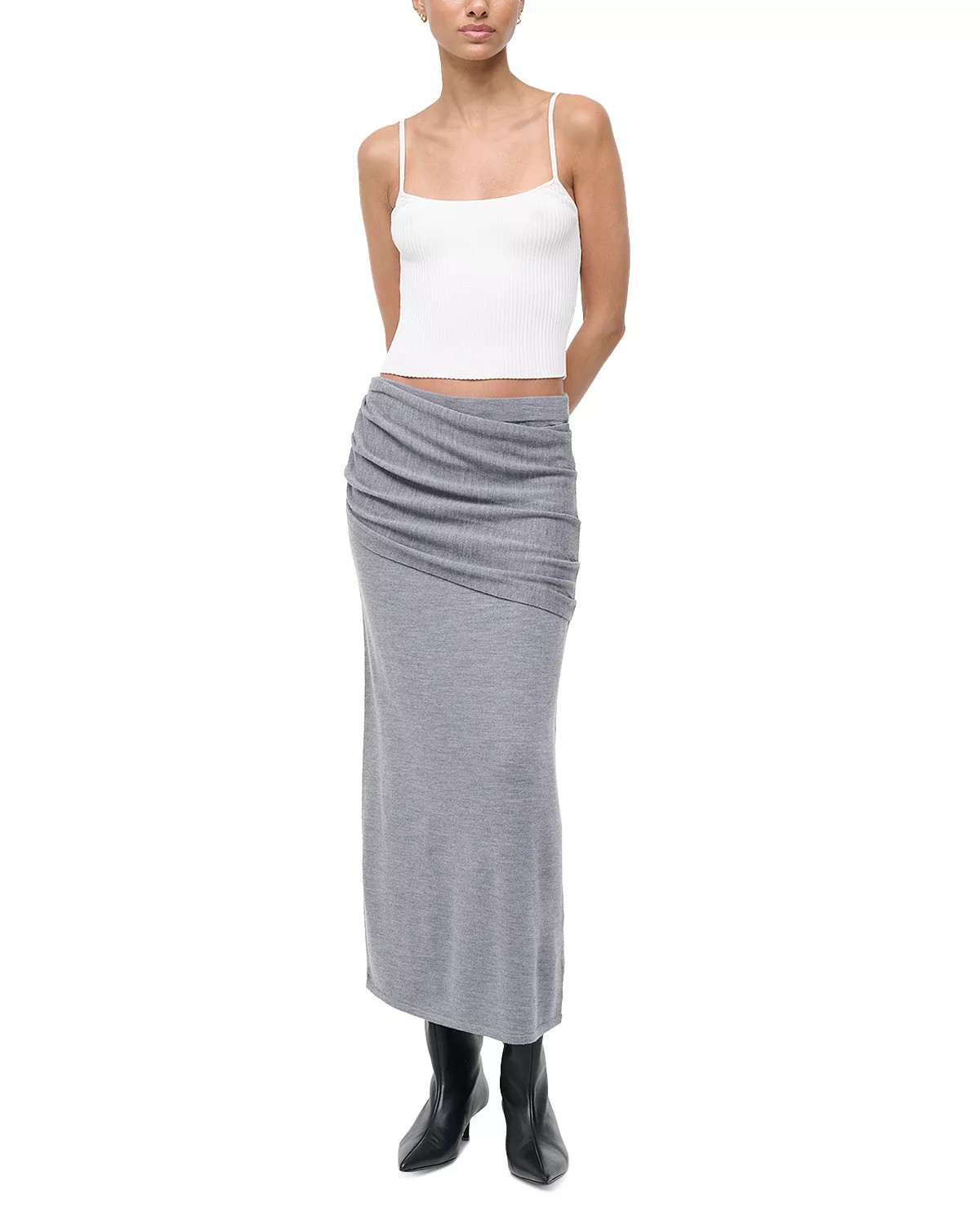 SIZE & FIT - Fits true to size, order your normal size - Model measurements: 5'10" height, wearing a size small PRODUCT DETAILS - Pull-on style - Asymmetric draped ruching at front hips - Imported Web ID: 5610435 MATERIAL & CARE - 100% merino wool - Dry clean