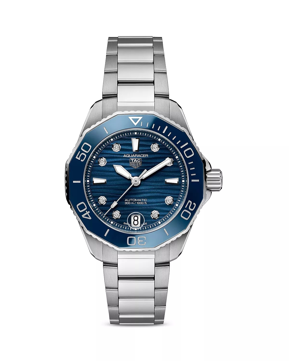 PRODUCT DETAILS - From the TAG Heuer Aquaracer collection - The ultimate sports watch, in stainless steel with shimmering blue sunray brushed dial. - Powered by the famous, ever-reliable Calibre 5 - Features professional diving watch essentials including screw-in crown, unidirectional rotating bezel, easy-read Super-LumiNova® markers, anti-reflective sapphire crystal and diving-suit bracelet with security clasp to prevent accidental opening - Stainless steel; sapphire crystal - Case size: 43mm - Deployment buckle closure - Water resistant to 30 ATM - Swiss automatic movement - Super-LumiNova® markers & date display at 3 o'clock - Unidirectional rotating bezel - Stainless steel link bracelet - Manufacturer's 2-year limited warranty - Photo may have been enlarged and/or enhanced. - Made in Switzerland Web ID: 4058378